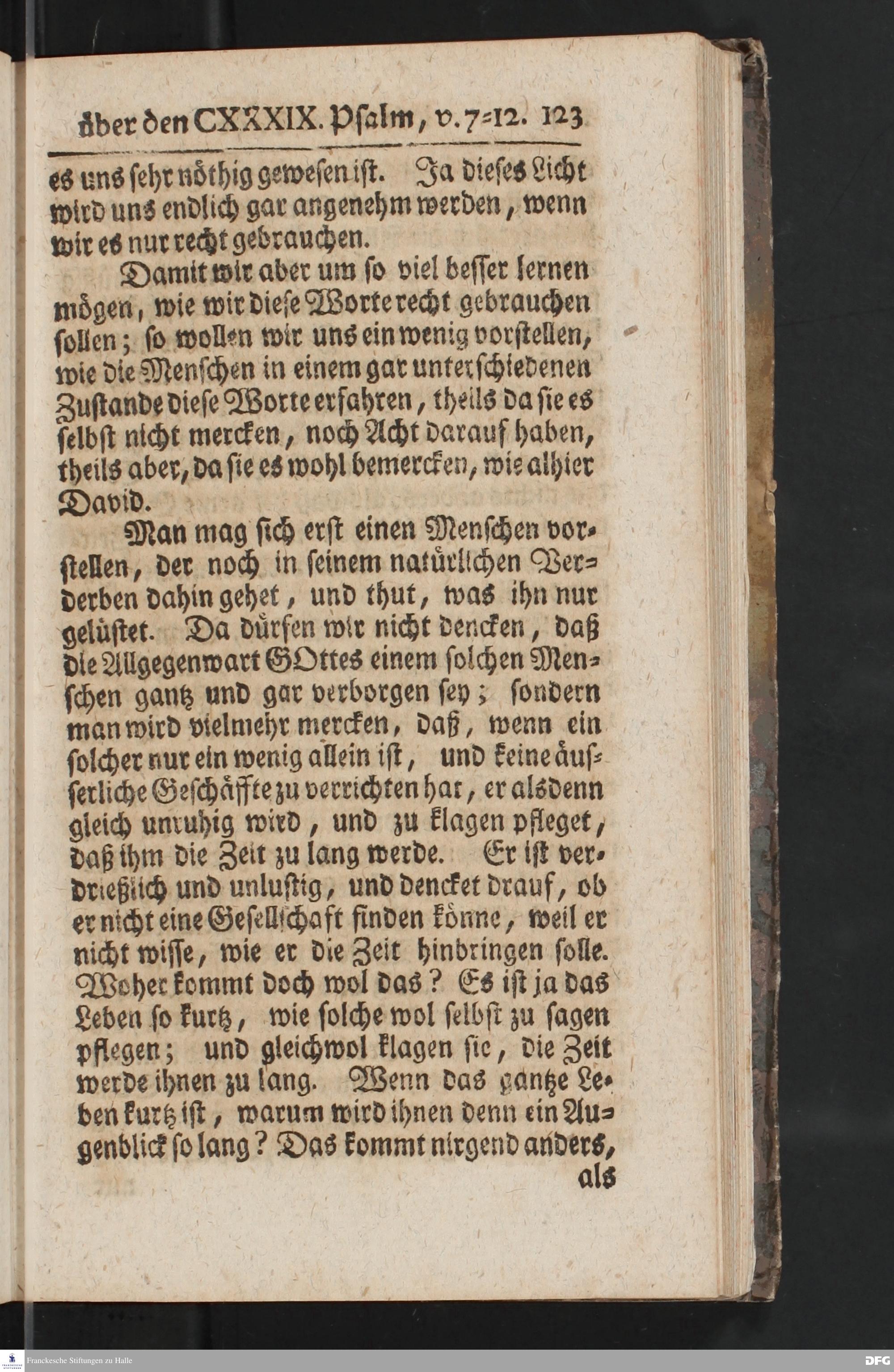 August Hermann Franckens, Weyl.Prof.Theol.Past.Ulr.und Schol. Erklärung Des hundert und neun und dreyßigsten Psalms / Auf Verlangen besonders herausgegeben Von Gotthilf August Francken, S.Theol.Prof.Ord.der ersten Dioeces des Saal=Creyses Insp.u.Pred.zur L.Fr. Andere Auflage. HALLE, In Verlegung des Wäysenhauses, 1739.