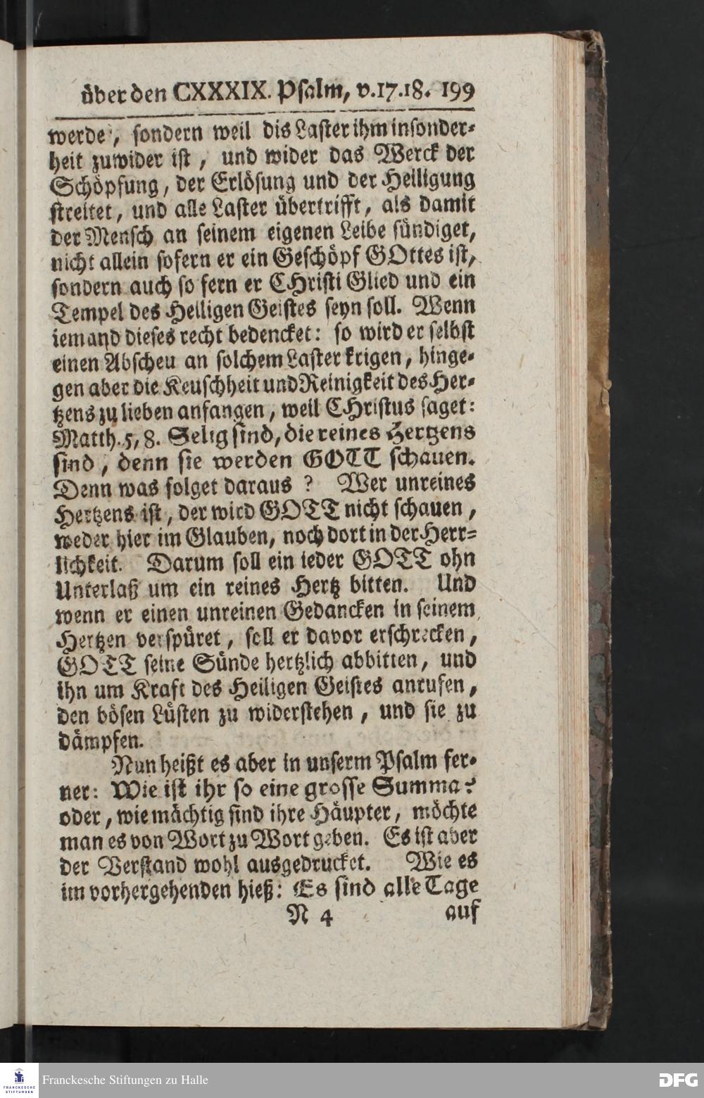 August Hermann Franckens, Weyl.Prof.Theol.Past.Ulr.und Schol. Erklärung Des hundert und neun und dreyßigsten Psalms / Auf Verlangen besonders herausgegeben Von Gotthilf August Francken, S.Theol.Prof.Ord.der ersten Dioeces des Saal=Creyses Insp.u.Pred.zur L.Fr. Andere Auflage. HALLE, In Verlegung des Wäysenhauses, 1739.