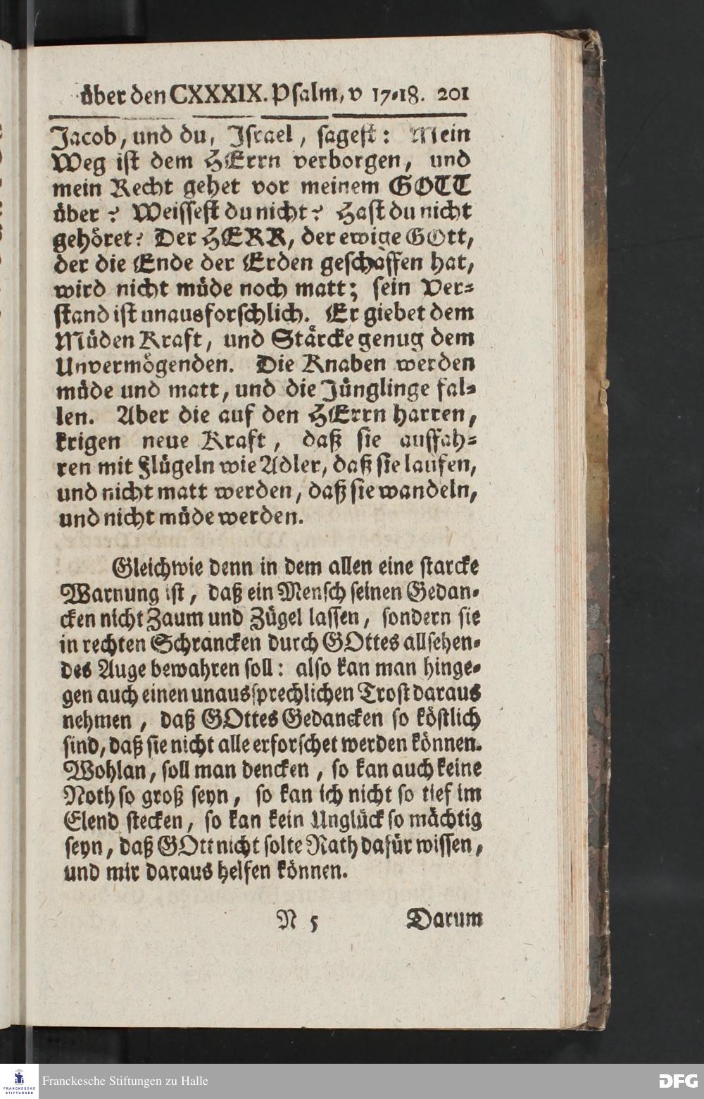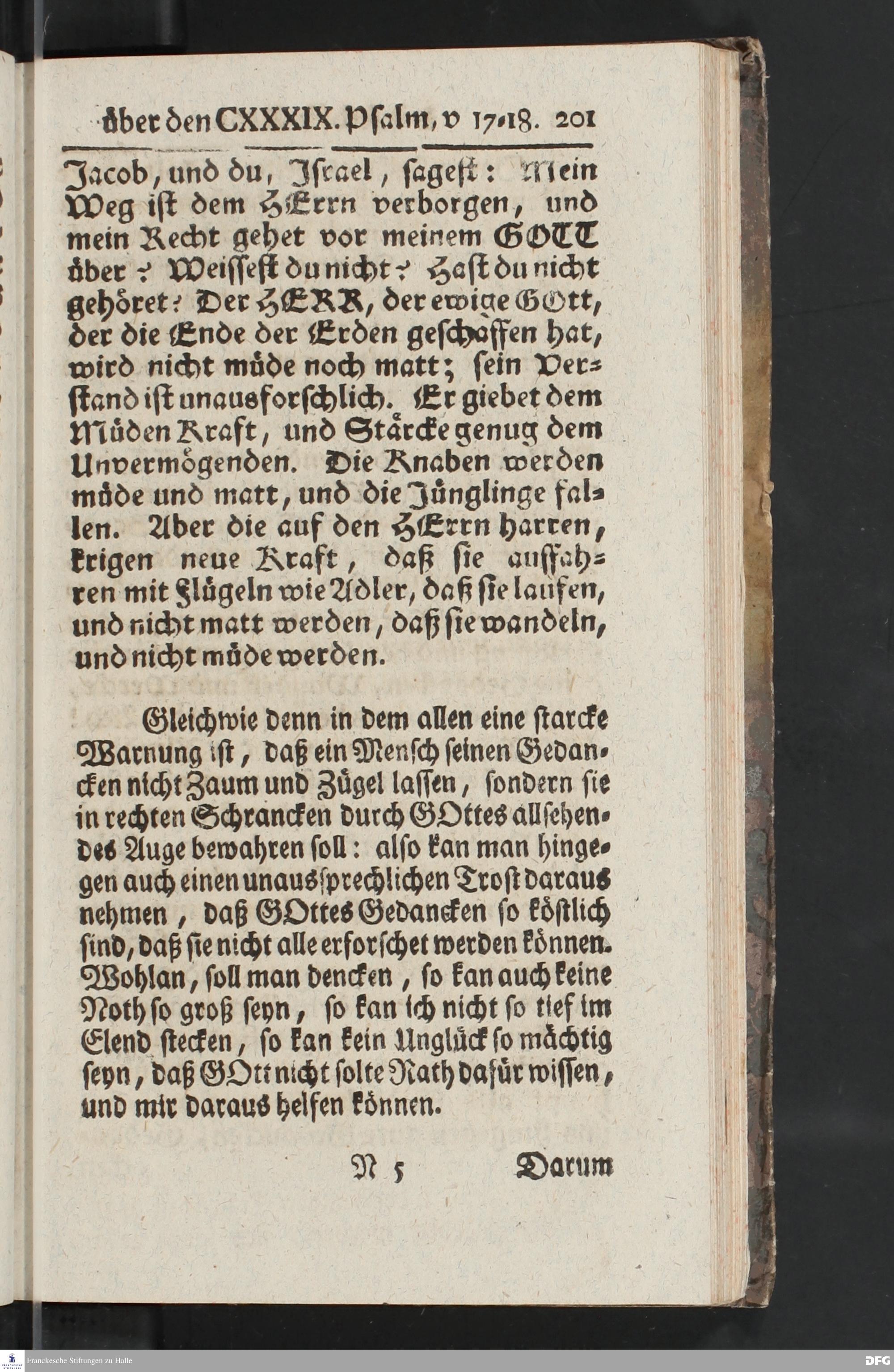 August Hermann Franckens, Weyl.Prof.Theol.Past.Ulr.und Schol. Erklärung Des hundert und neun und dreyßigsten Psalms / Auf Verlangen besonders herausgegeben Von Gotthilf August Francken, S.Theol.Prof.Ord.der ersten Dioeces des Saal=Creyses Insp.u.Pred.zur L.Fr. Andere Auflage. HALLE, In Verlegung des Wäysenhauses, 1739.