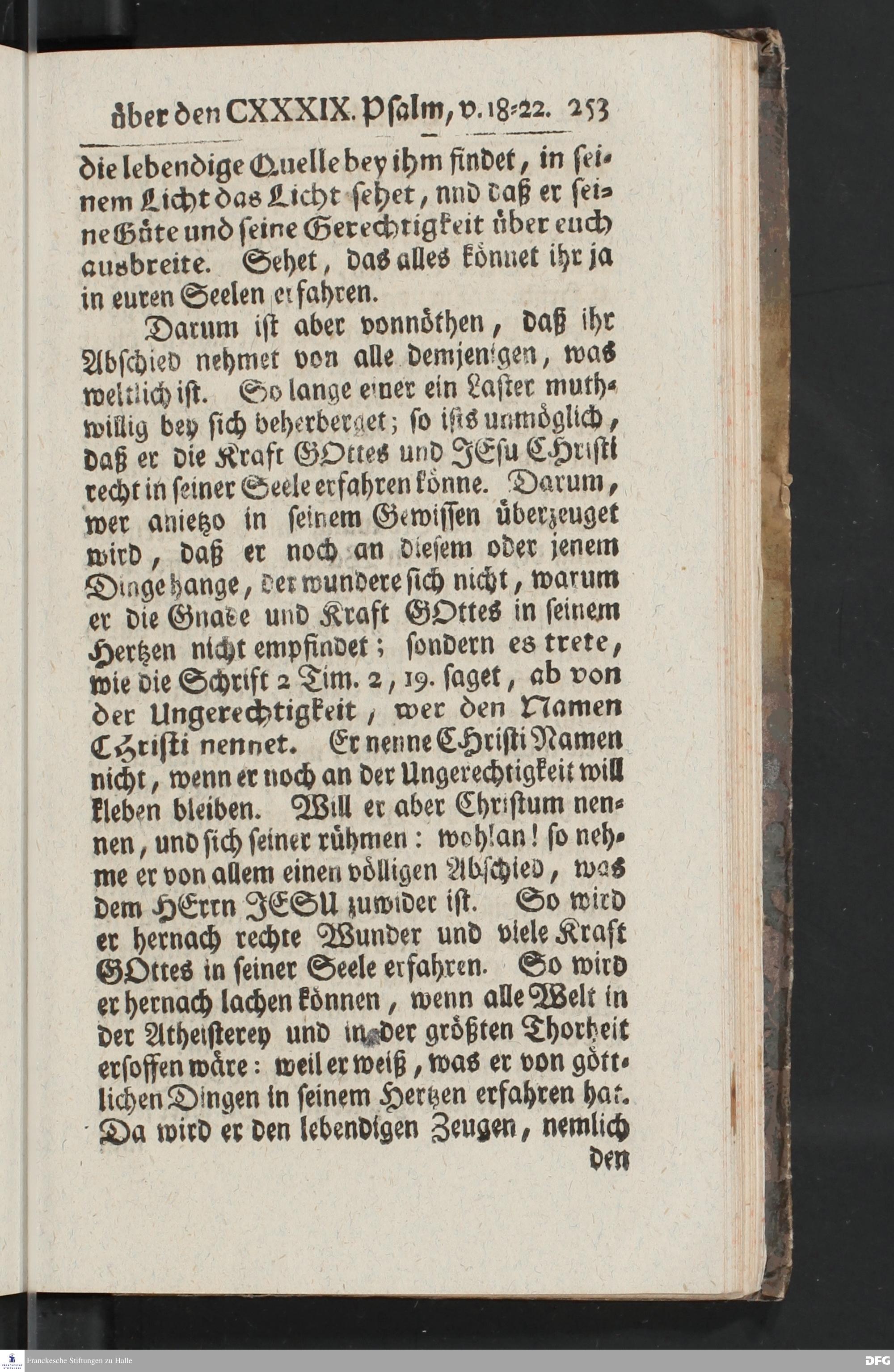 August Hermann Franckens, Weyl.Prof.Theol.Past.Ulr.und Schol. Erklärung Des hundert und neun und dreyßigsten Psalms / Auf Verlangen besonders herausgegeben Von Gotthilf August Francken, S.Theol.Prof.Ord.der ersten Dioeces des Saal=Creyses Insp.u.Pred.zur L.Fr. Andere Auflage. HALLE, In Verlegung des Wäysenhauses, 1739.