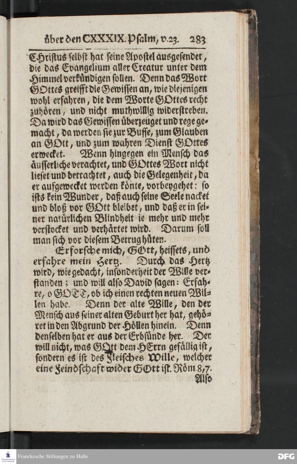 August Hermann Franckens, Weyl.Prof.Theol.Past.Ulr.und Schol. Erklärung Des hundert und neun und dreyßigsten Psalms / Auf Verlangen besonders herausgegeben Von Gotthilf August Francken, S.Theol.Prof.Ord.der ersten Dioeces des Saal=Creyses Insp.u.Pred.zur L.Fr. Andere Auflage. HALLE, In Verlegung des Wäysenhauses, 1739.