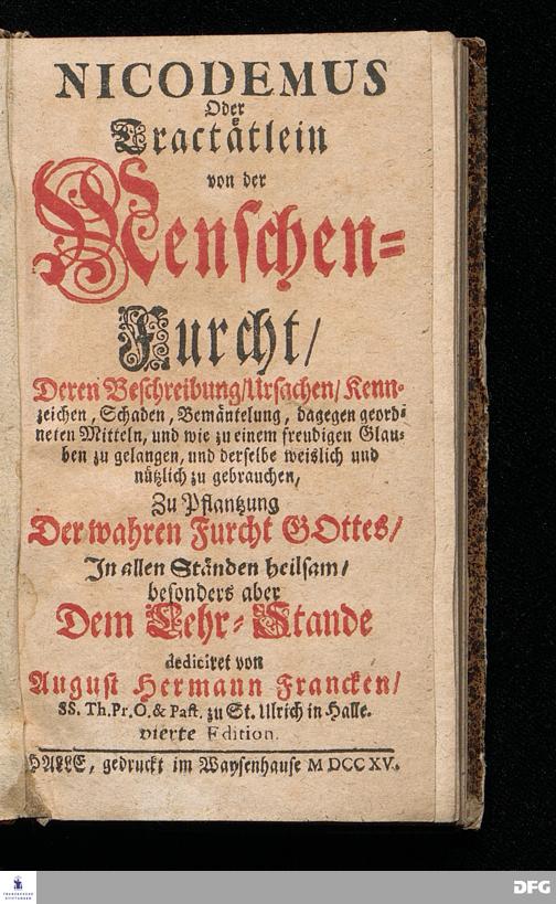 NICODEMUS Oder Tractätlein von der Menschen=Furcht / Deren Beschreibung / Ursachen / Kennzeichen, Schaden, Bemäntelung, dagegen geordneten Mitteln, und wie zu einem freudigen Glauben zu gelangen, und derselbe weislich und nützlich zu gebrauchen, Zu Pflantzung Der wahren Furcht GOttes / In allen Ständen heilsam / besonders aber Dem Lehr=Stande dediciret von August Hermann Francken / SS.Th.Pr.O.& Past.zu St.Ulrich in Halle. vierte Edition. HALLE, gedruckt im Waysenhause MDCCXV.