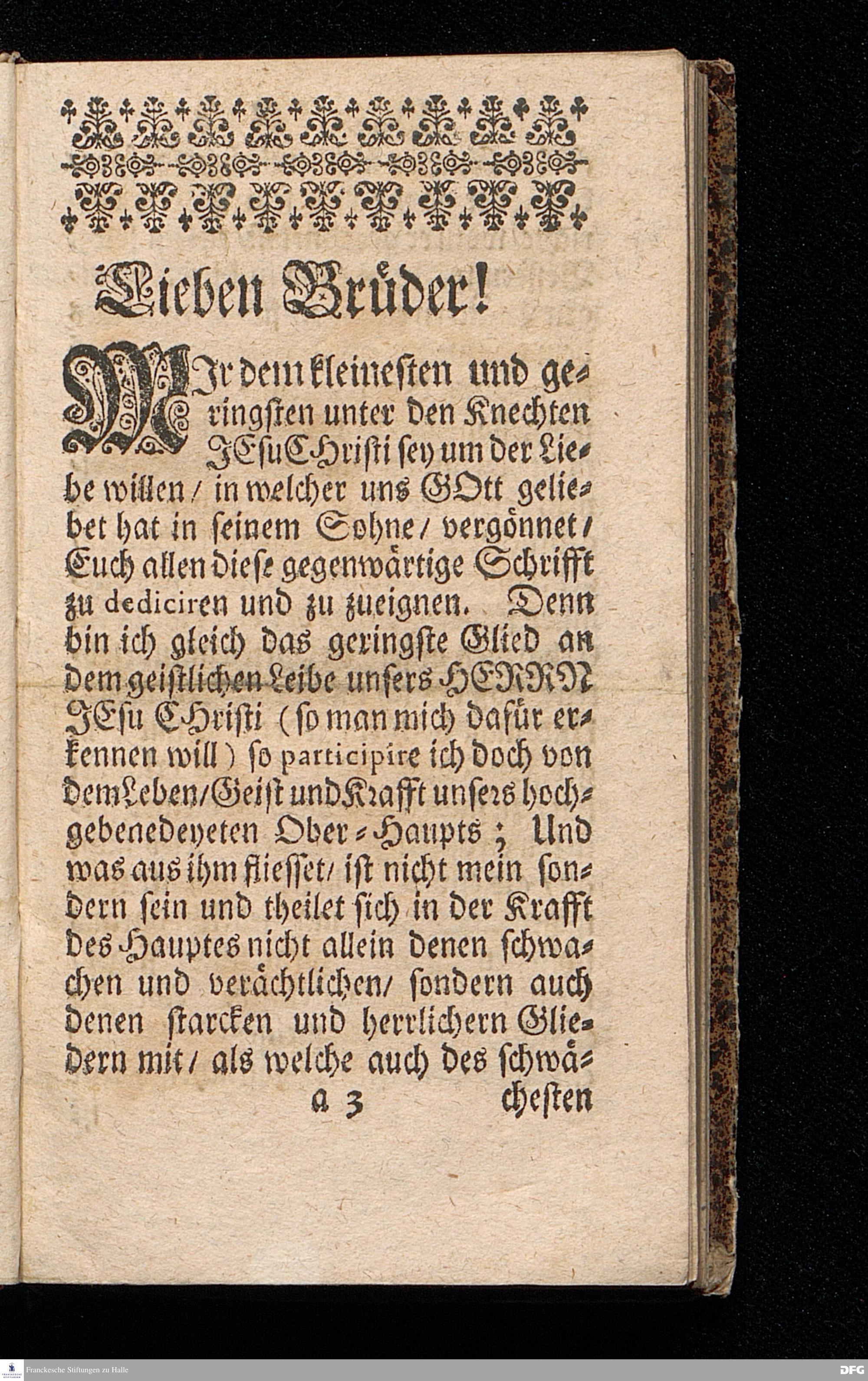 NICODEMUS Oder Tractätlein von der Menschen=Furcht / Deren Beschreibung / Ursachen / Kennzeichen, Schaden, Bemäntelung, dagegen geordneten Mitteln, und wie zu einem freudigen Glauben zu gelangen, und derselbe weislich und nützlich zu gebrauchen, Zu Pflantzung Der wahren Furcht GOttes / In allen Ständen heilsam / besonders aber Dem Lehr=Stande dediciret von August Hermann Francken / SS.Th.Pr.O.& Past.zu St.Ulrich in Halle. vierte Edition. HALLE, gedruckt im Waysenhause MDCCXV.