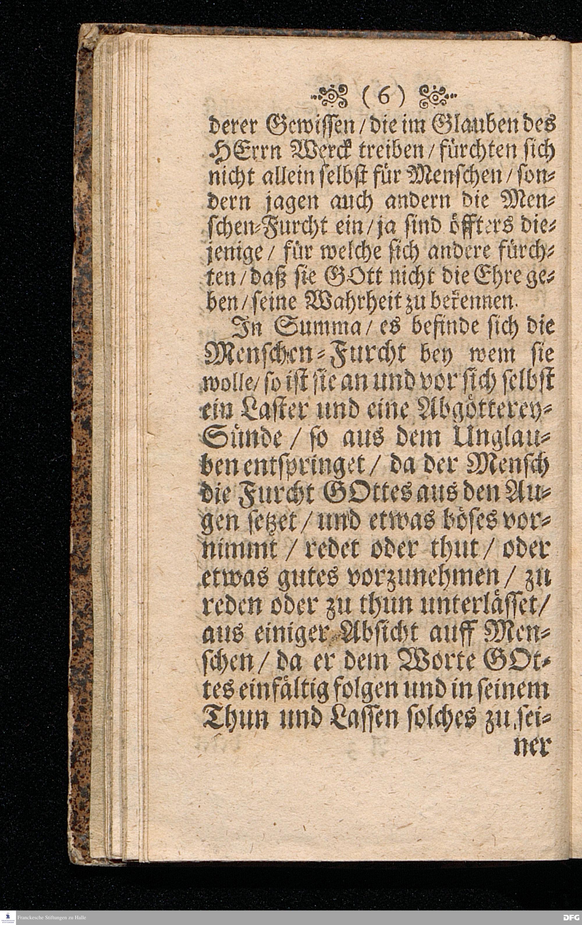 NICODEMUS Oder Tractätlein von der Menschen=Furcht / Deren Beschreibung / Ursachen / Kennzeichen, Schaden, Bemäntelung, dagegen geordneten Mitteln, und wie zu einem freudigen Glauben zu gelangen, und derselbe weislich und nützlich zu gebrauchen, Zu Pflantzung Der wahren Furcht GOttes / In allen Ständen heilsam / besonders aber Dem Lehr=Stande dediciret von August Hermann Francken / SS.Th.Pr.O.& Past.zu St.Ulrich in Halle. vierte Edition. HALLE, gedruckt im Waysenhause MDCCXV.