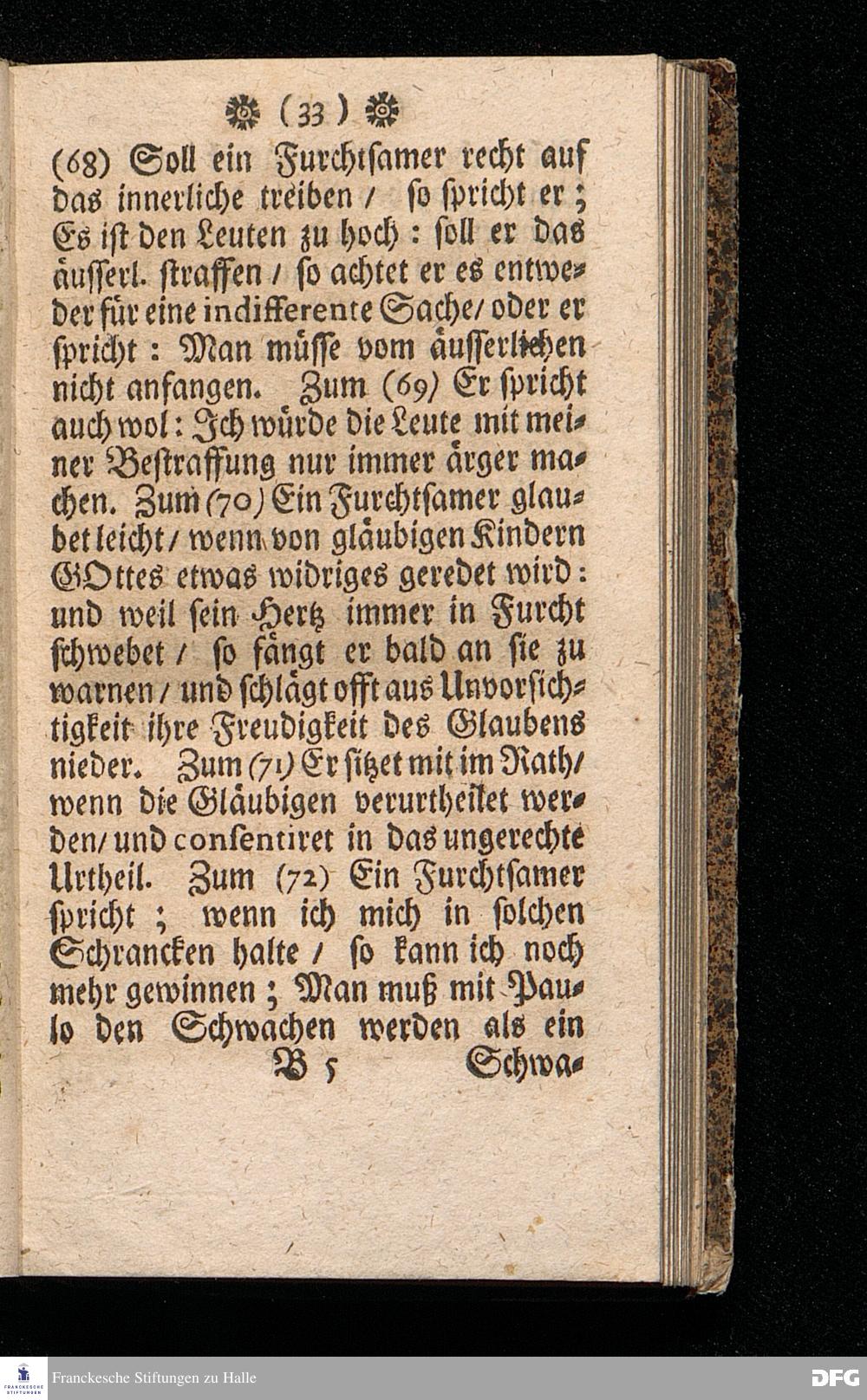 NICODEMUS Oder Tractätlein von der Menschen=Furcht / Deren Beschreibung / Ursachen / Kennzeichen, Schaden, Bemäntelung, dagegen geordneten Mitteln, und wie zu einem freudigen Glauben zu gelangen, und derselbe weislich und nützlich zu gebrauchen, Zu Pflantzung Der wahren Furcht GOttes / In allen Ständen heilsam / besonders aber Dem Lehr=Stande dediciret von August Hermann Francken / SS.Th.Pr.O.& Past.zu St.Ulrich in Halle. vierte Edition. HALLE, gedruckt im Waysenhause MDCCXV.