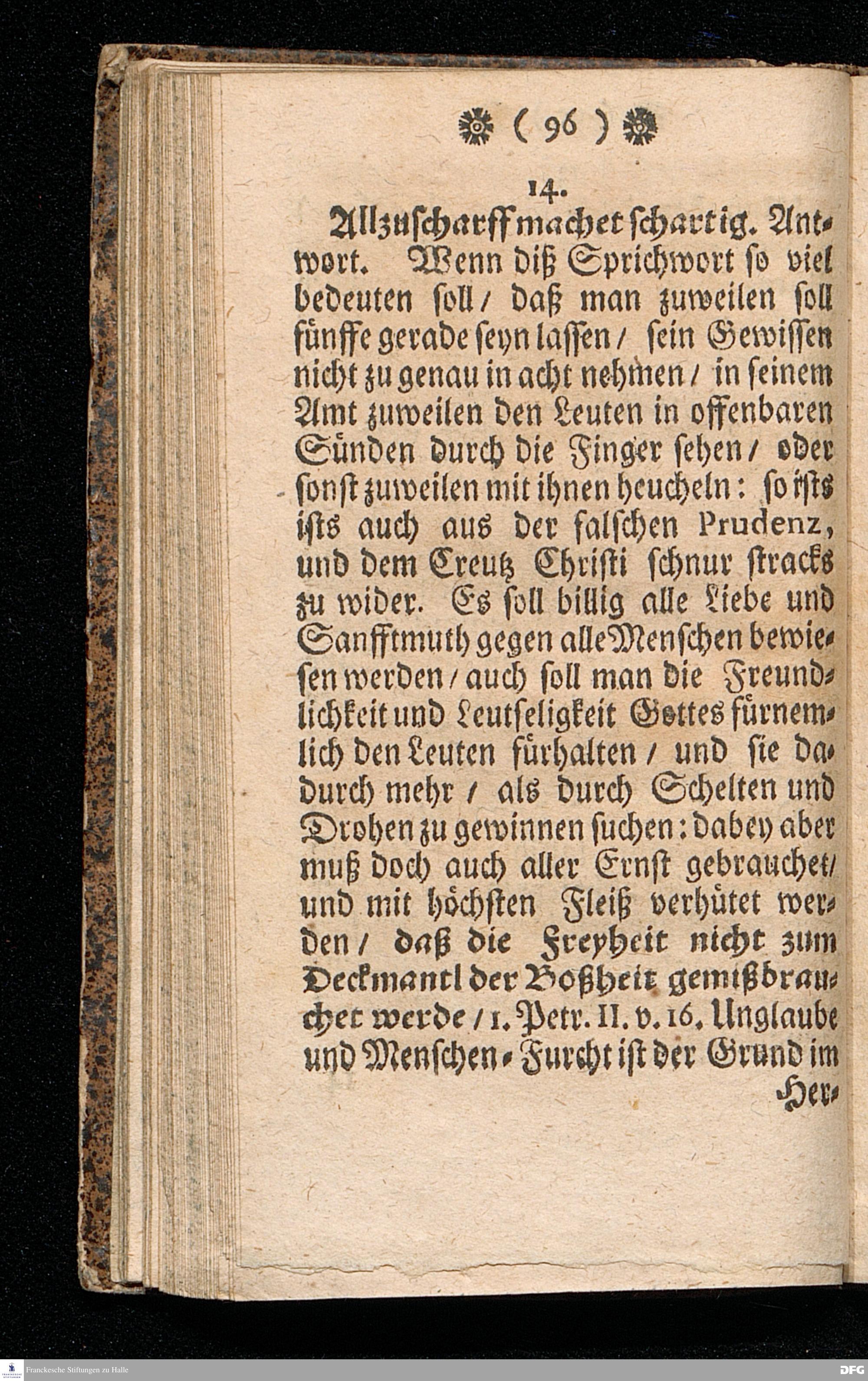 NICODEMUS Oder Tractätlein von der Menschen=Furcht / Deren Beschreibung / Ursachen / Kennzeichen, Schaden, Bemäntelung, dagegen geordneten Mitteln, und wie zu einem freudigen Glauben zu gelangen, und derselbe weislich und nützlich zu gebrauchen, Zu Pflantzung Der wahren Furcht GOttes / In allen Ständen heilsam / besonders aber Dem Lehr=Stande dediciret von August Hermann Francken / SS.Th.Pr.O.& Past.zu St.Ulrich in Halle. vierte Edition. HALLE, gedruckt im Waysenhause MDCCXV.