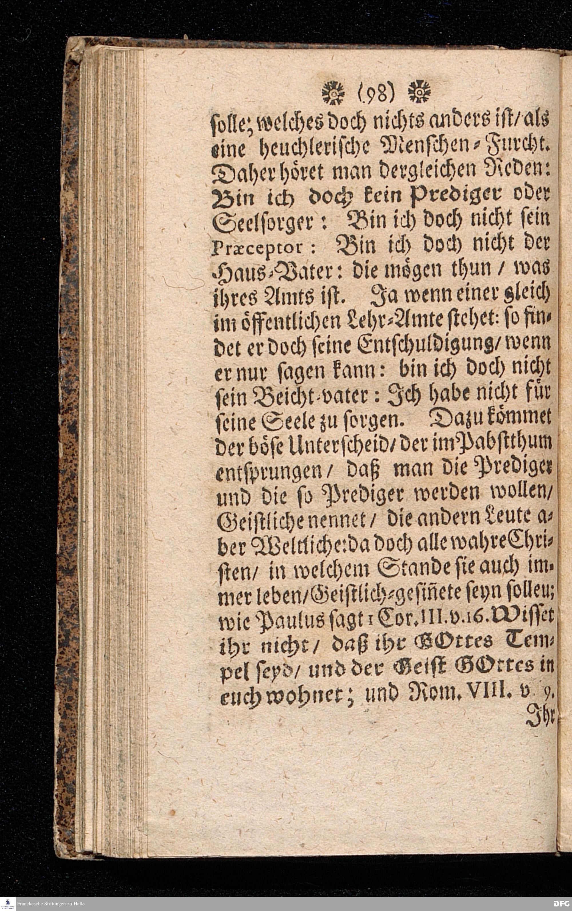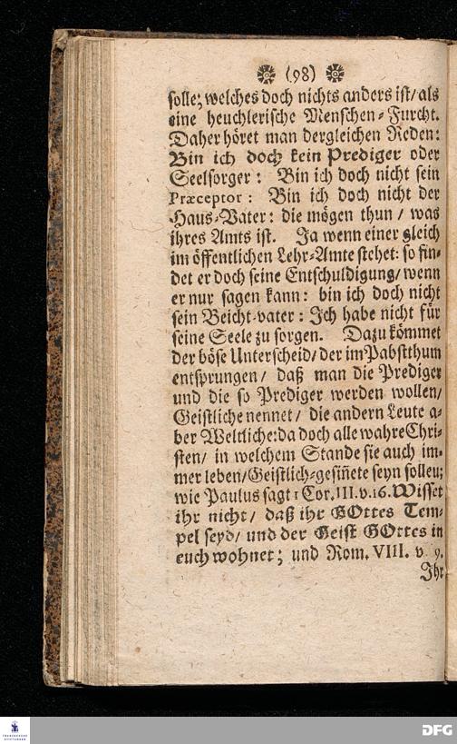 NICODEMUS Oder Tractätlein von der Menschen=Furcht / Deren Beschreibung / Ursachen / Kennzeichen, Schaden, Bemäntelung, dagegen geordneten Mitteln, und wie zu einem freudigen Glauben zu gelangen, und derselbe weislich und nützlich zu gebrauchen, Zu Pflantzung Der wahren Furcht GOttes / In allen Ständen heilsam / besonders aber Dem Lehr=Stande dediciret von August Hermann Francken / SS.Th.Pr.O.& Past.zu St.Ulrich in Halle. vierte Edition. HALLE, gedruckt im Waysenhause MDCCXV.
