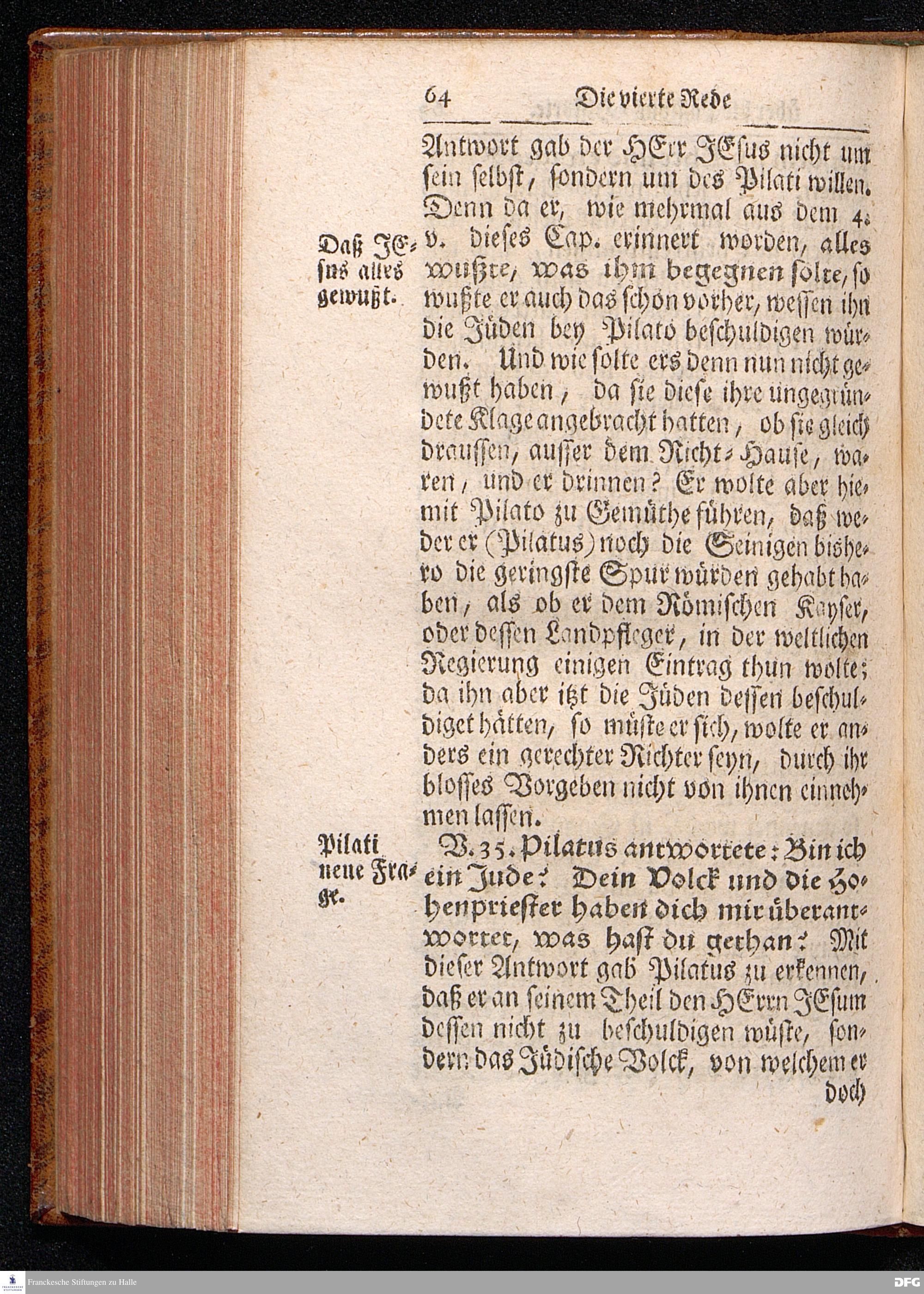 August Hermann Franckens / S.Theol.Prof.& Past.zu St.Ulrich und des Gymnasii Scholarchæ, Oeffentliche Reden über die Paßions=Historie, Wie dieselbe vom Evangelisten Johanne im 18.u.19. Capitel beschrieben ist, gehalten Von Esto mihi bis Ostern 1716. In dem Wäysenhause zu Glaucha an Halle. EDITIO III. HALLE, Gedruckt und verlegt im Wäysenhause, MDCCXXXIII.