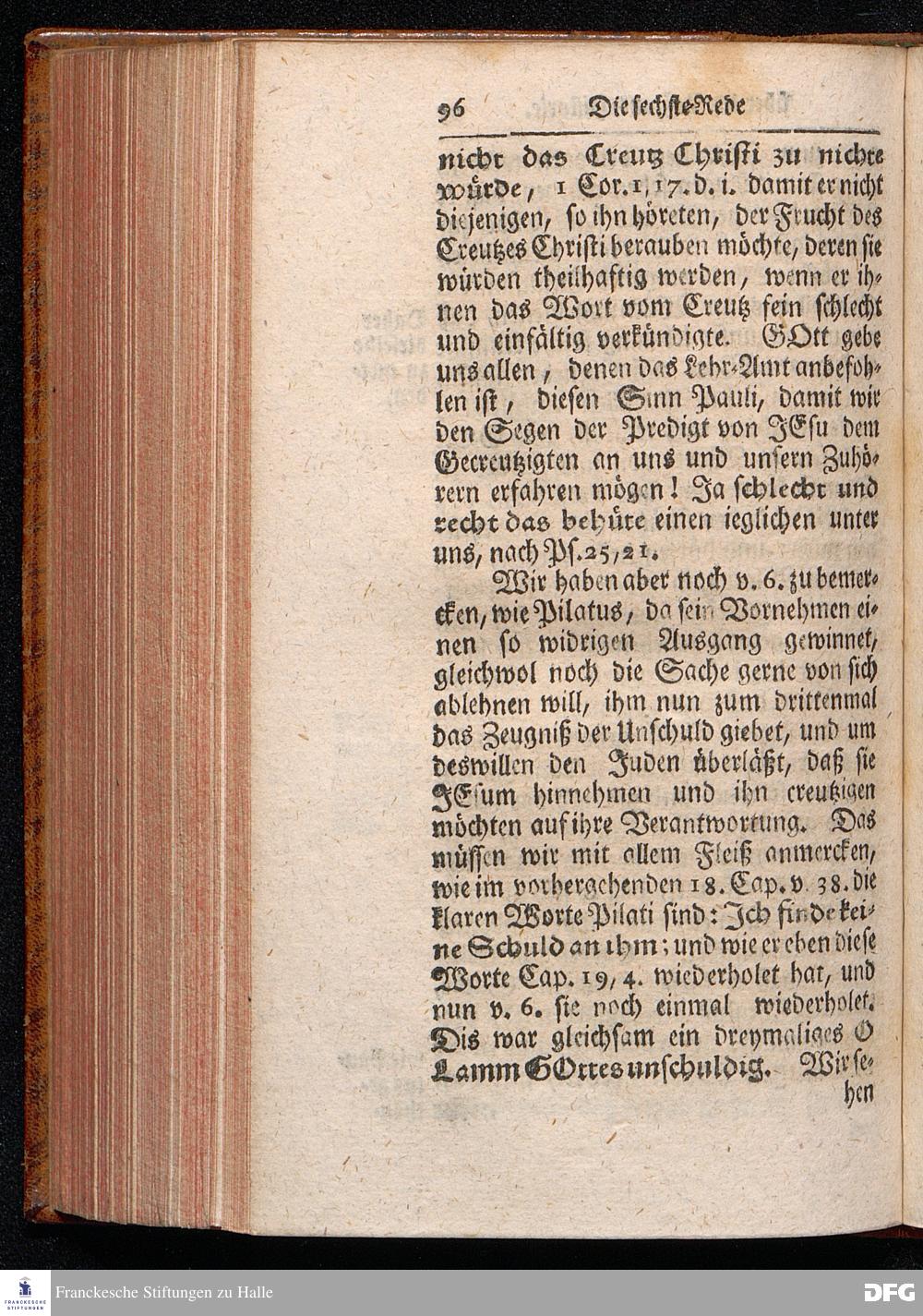 August Hermann Franckens / S.Theol.Prof.& Past.zu St.Ulrich und des Gymnasii Scholarchæ, Oeffentliche Reden über die Paßions=Historie, Wie dieselbe vom Evangelisten Johanne im 18.u.19. Capitel beschrieben ist, gehalten Von Esto mihi bis Ostern 1716. In dem Wäysenhause zu Glaucha an Halle. EDITIO III. HALLE, Gedruckt und verlegt im Wäysenhause, MDCCXXXIII.