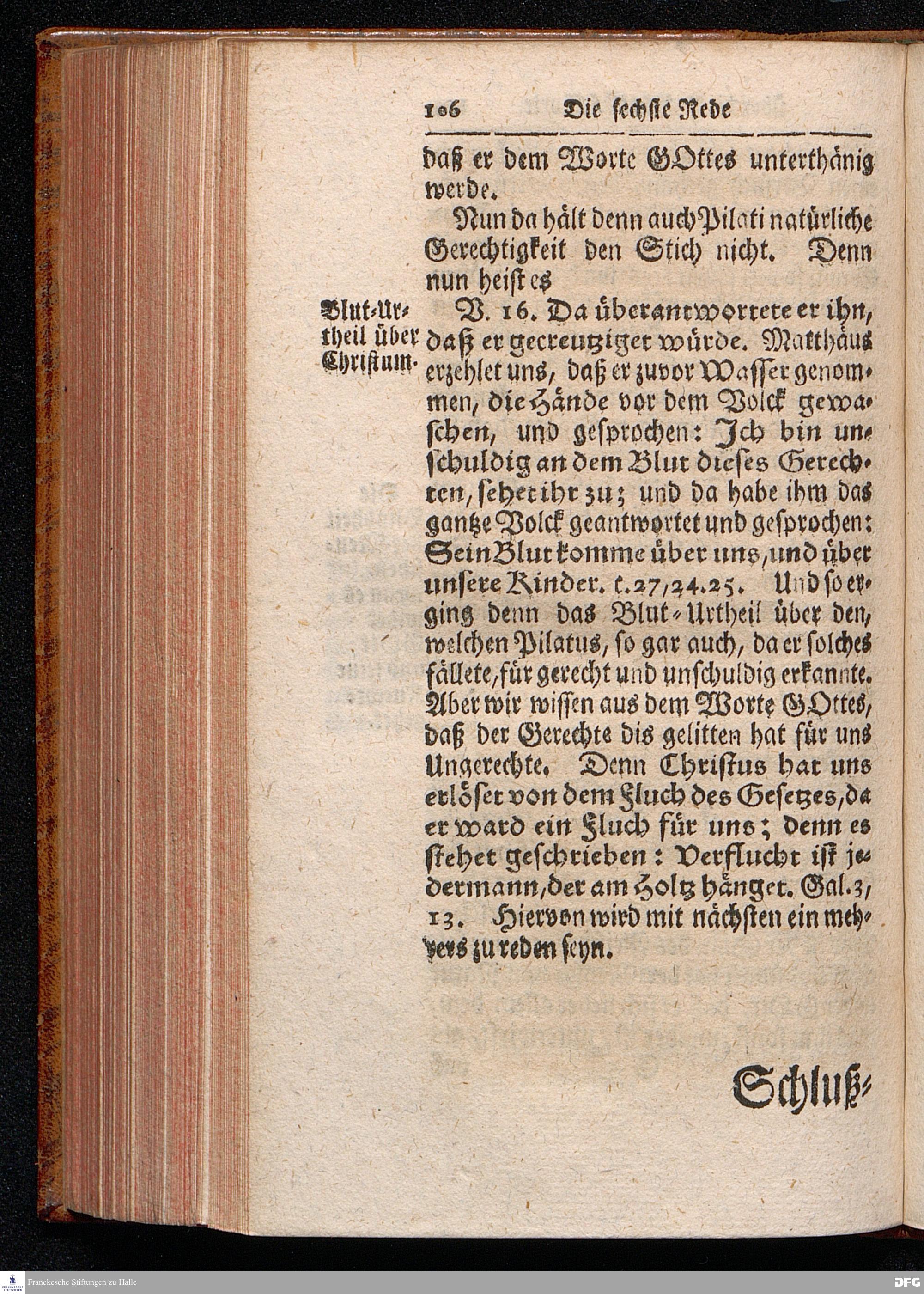 August Hermann Franckens / S.Theol.Prof.& Past.zu St.Ulrich und des Gymnasii Scholarchæ, Oeffentliche Reden über die Paßions=Historie, Wie dieselbe vom Evangelisten Johanne im 18.u.19. Capitel beschrieben ist, gehalten Von Esto mihi bis Ostern 1716. In dem Wäysenhause zu Glaucha an Halle. EDITIO III. HALLE, Gedruckt und verlegt im Wäysenhause, MDCCXXXIII.