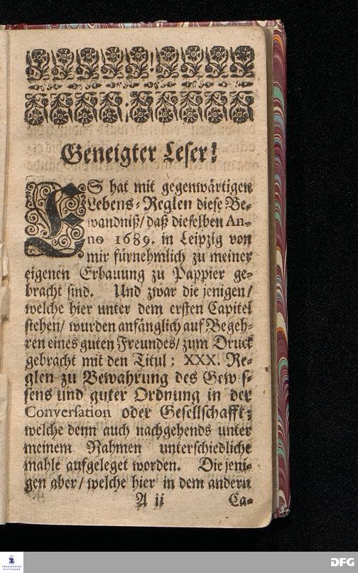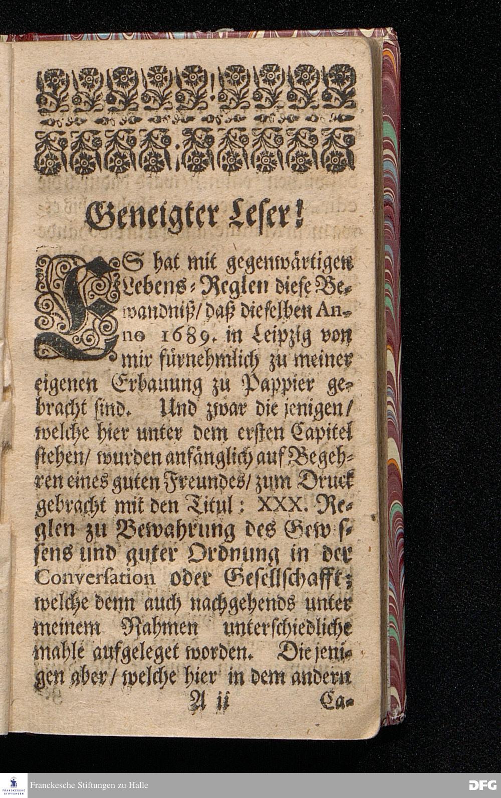 M.August Hermann Franckens Gr.& Or.Lingg.P.P.& P.Glauch. Schrifftmäßige Lebens=Reglen / Wie man so wohl bey als ausser der Gesellschafft die Liebe und Freundligkeit gegen den Nechsten / und Freudigkeit eines guten Gewissens für GOTT bewahren / und im Christenthum zunehmen soll. LEIPZIG / Bey Johann Heinichens seel.Wittib. 1695.