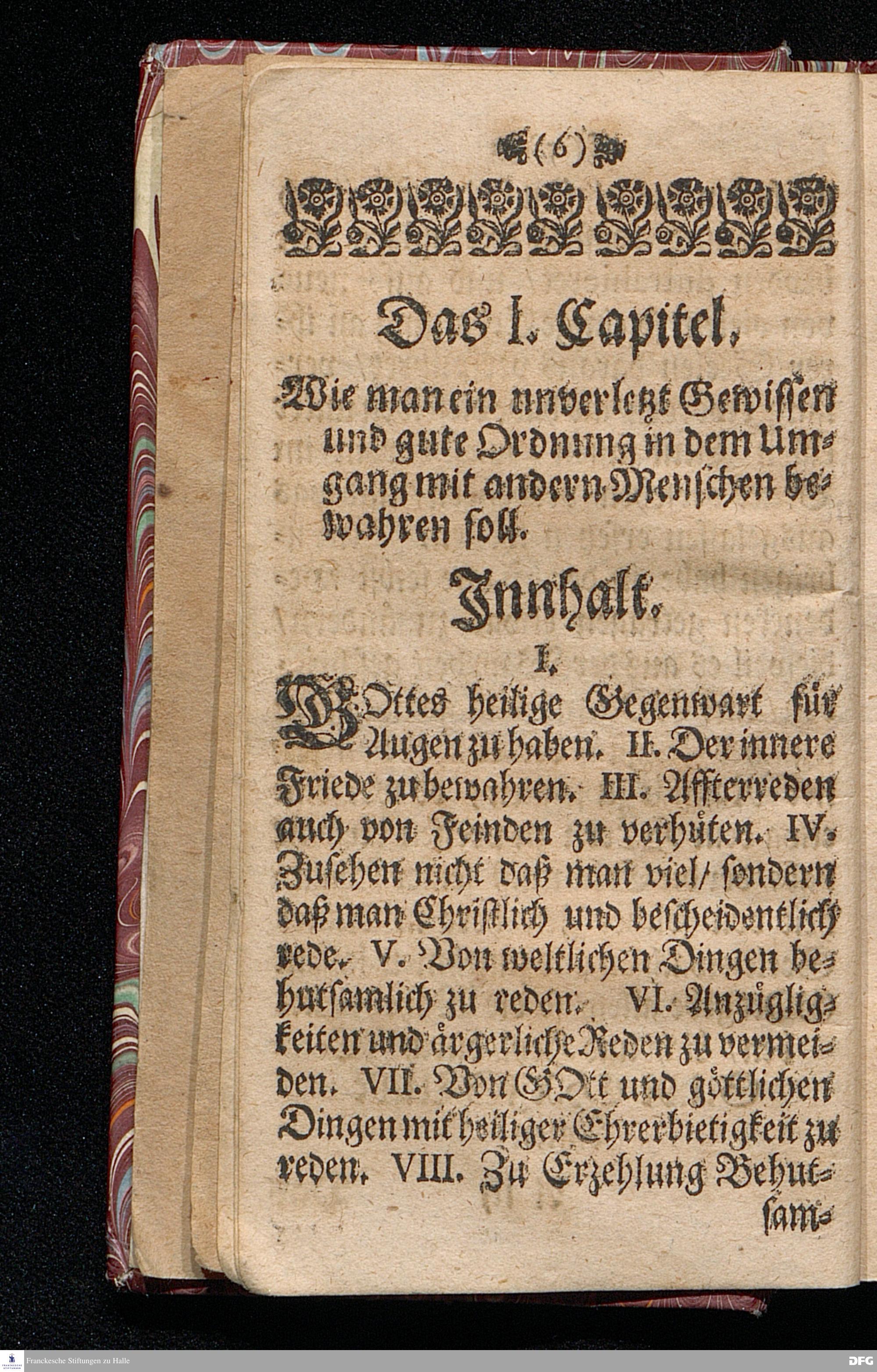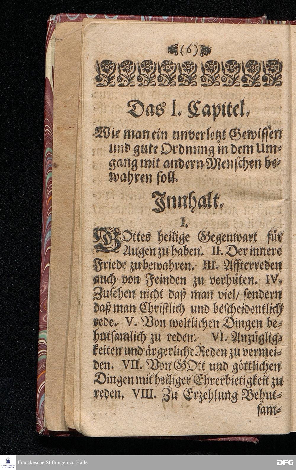 M.August Hermann Franckens Gr.& Or.Lingg.P.P.& P.Glauch. Schrifftmäßige Lebens=Reglen / Wie man so wohl bey als ausser der Gesellschafft die Liebe und Freundligkeit gegen den Nechsten / und Freudigkeit eines guten Gewissens für GOTT bewahren / und im Christenthum zunehmen soll. LEIPZIG / Bey Johann Heinichens seel.Wittib. 1695.