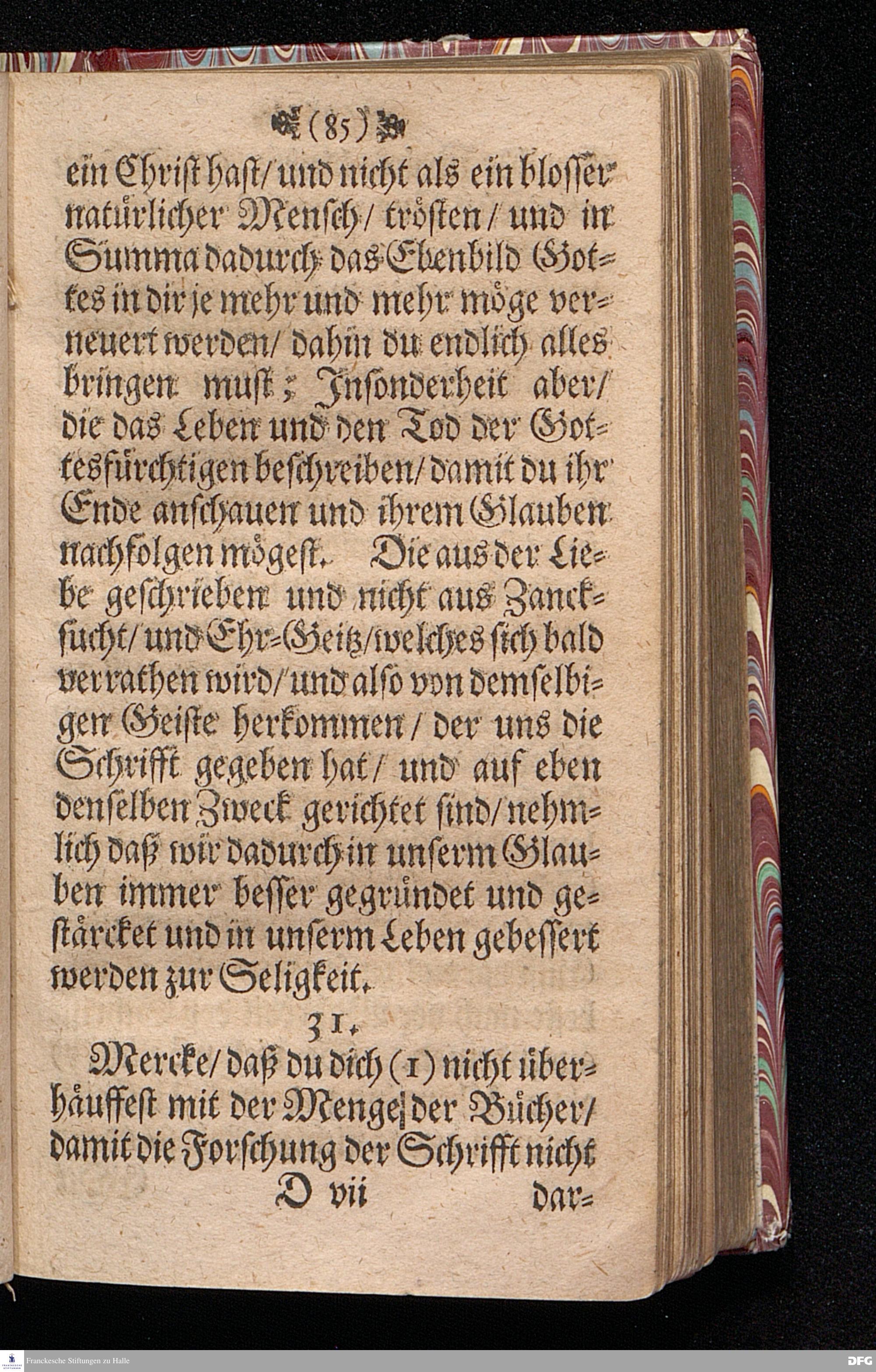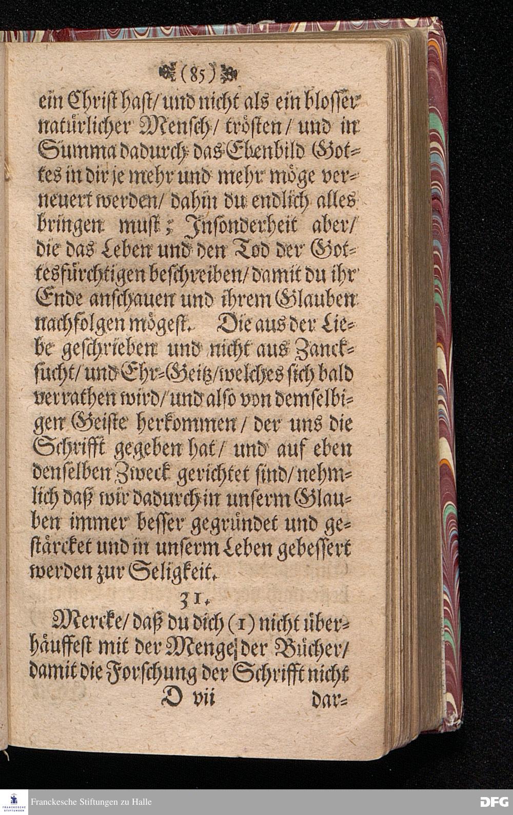 M.August Hermann Franckens Gr.& Or.Lingg.P.P.& P.Glauch. Schrifftmäßige Lebens=Reglen / Wie man so wohl bey als ausser der Gesellschafft die Liebe und Freundligkeit gegen den Nechsten / und Freudigkeit eines guten Gewissens für GOTT bewahren / und im Christenthum zunehmen soll. LEIPZIG / Bey Johann Heinichens seel.Wittib. 1695.