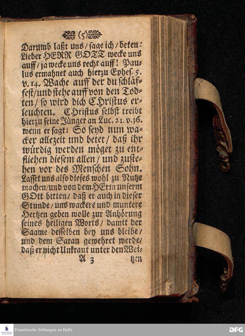 Die Gefährlichkeit des Schlaffs der Sicherheit / Am V.Sonntag nach Epiphan. ANNO 1698 In einer Predigt Aus dem Evangelio Matth.XIII. v.24--30. In der St.Georgen=Kirche zu Glaucha an Halle vorgestellet / von August Hermann Francken / S.S.Theol.Profess.P.Ordin.& Past.Glauch. HALLE / Druckts Christian Henckel / Univ.Buchdrucker.