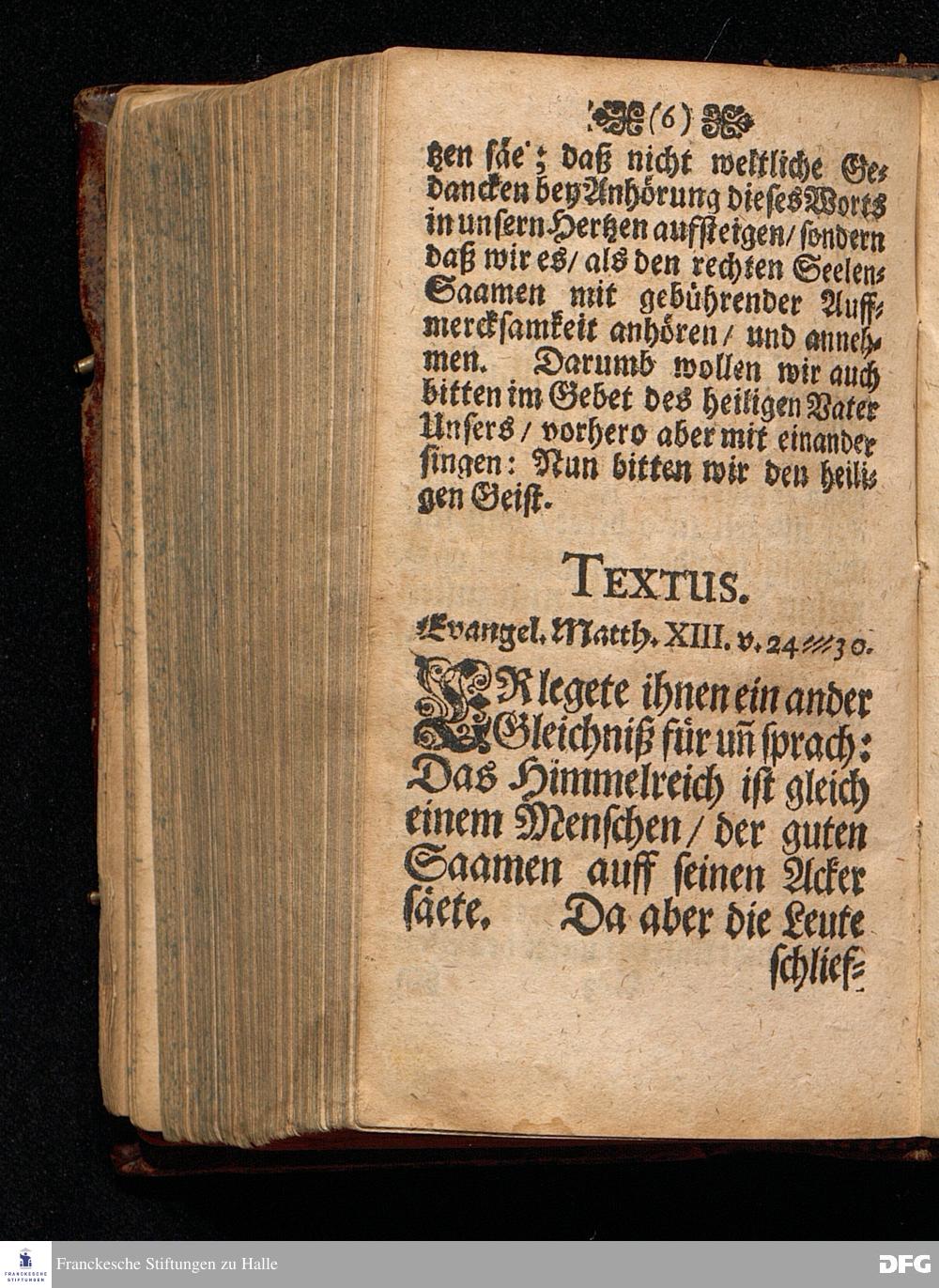 Die Gefährlichkeit des Schlaffs der Sicherheit / Am V.Sonntag nach Epiphan. ANNO 1698 In einer Predigt Aus dem Evangelio Matth.XIII. v.24--30. In der St.Georgen=Kirche zu Glaucha an Halle vorgestellet / von August Hermann Francken / S.S.Theol.Profess.P.Ordin.& Past.Glauch. HALLE / Druckts Christian Henckel / Univ.Buchdrucker.