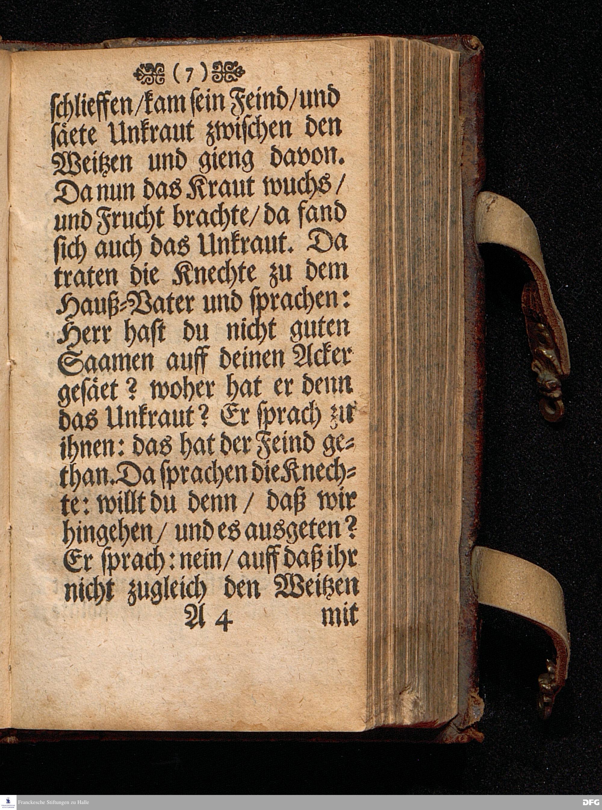 Die Gefährlichkeit des Schlaffs der Sicherheit / Am V.Sonntag nach Epiphan. ANNO 1698 In einer Predigt Aus dem Evangelio Matth.XIII. v.24--30. In der St.Georgen=Kirche zu Glaucha an Halle vorgestellet / von August Hermann Francken / S.S.Theol.Profess.P.Ordin.& Past.Glauch. HALLE / Druckts Christian Henckel / Univ.Buchdrucker.
