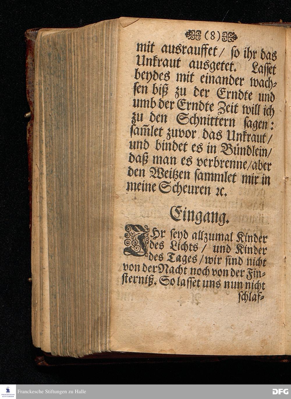 Die Gefährlichkeit des Schlaffs der Sicherheit / Am V.Sonntag nach Epiphan. ANNO 1698 In einer Predigt Aus dem Evangelio Matth.XIII. v.24--30. In der St.Georgen=Kirche zu Glaucha an Halle vorgestellet / von August Hermann Francken / S.S.Theol.Profess.P.Ordin.& Past.Glauch. HALLE / Druckts Christian Henckel / Univ.Buchdrucker.