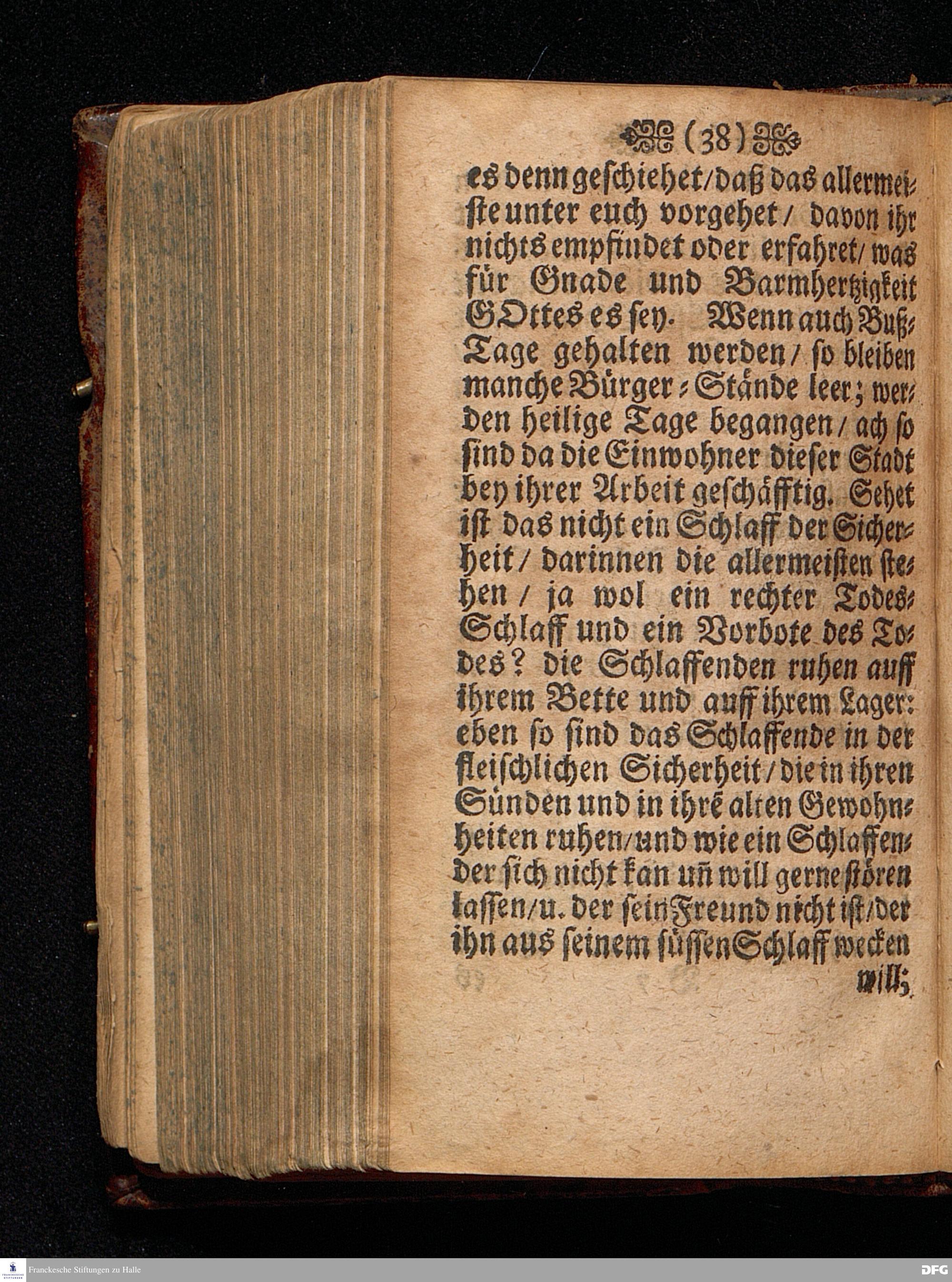 Die Gefährlichkeit des Schlaffs der Sicherheit / Am V.Sonntag nach Epiphan. ANNO 1698 In einer Predigt Aus dem Evangelio Matth.XIII. v.24--30. In der St.Georgen=Kirche zu Glaucha an Halle vorgestellet / von August Hermann Francken / S.S.Theol.Profess.P.Ordin.& Past.Glauch. HALLE / Druckts Christian Henckel / Univ.Buchdrucker.