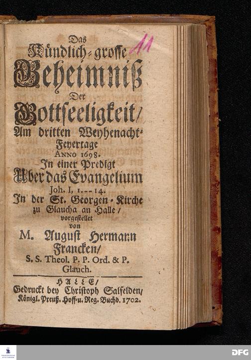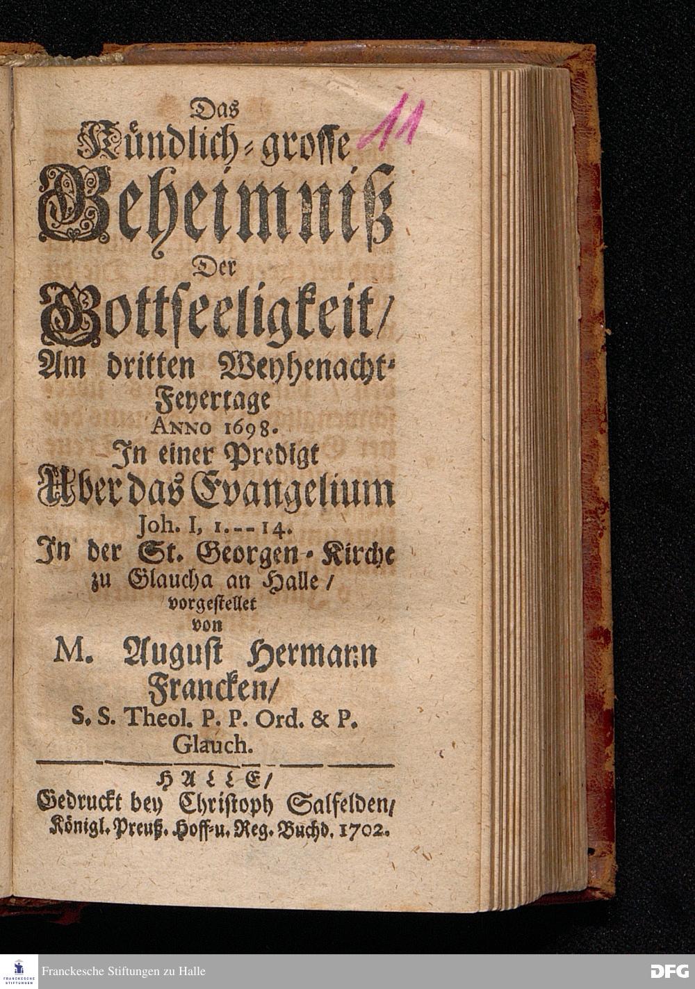Das Kündlich=grosse Geheimniß Der Gottseeligkeit / Am dritten Weyhenacht=Feyertage ANNO 1698. In einer Predigt Uber das Evangelium Joh.I, 1--14. In der St. Georgen=Kirche zu Glaucha an Halle / vorgestellet von M.August Hermann Francken / S.S.Theol.P.P.Ord.& P.Glauch. HALLE / Gedruckt bey Christoph Salfelden / Königl.Preuß.Hoff-u.Reg.Buchd. 1702