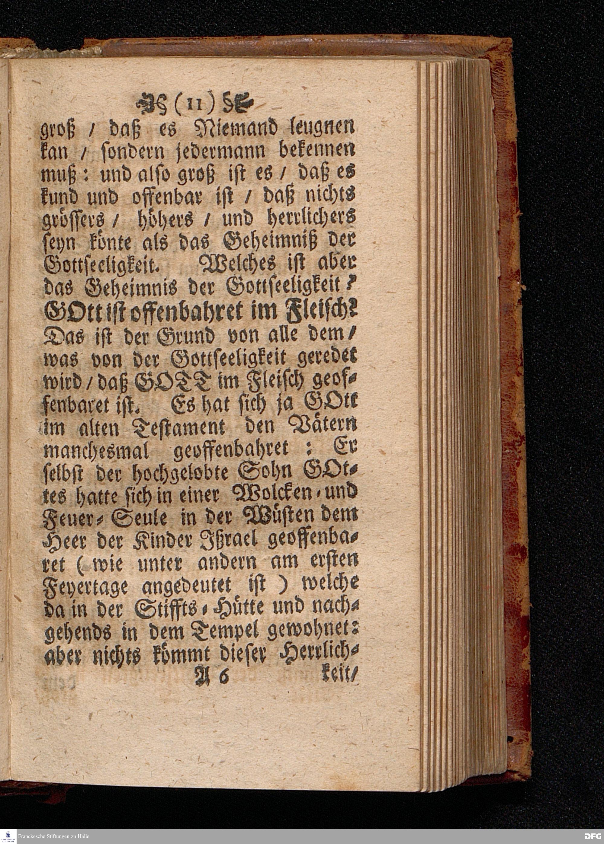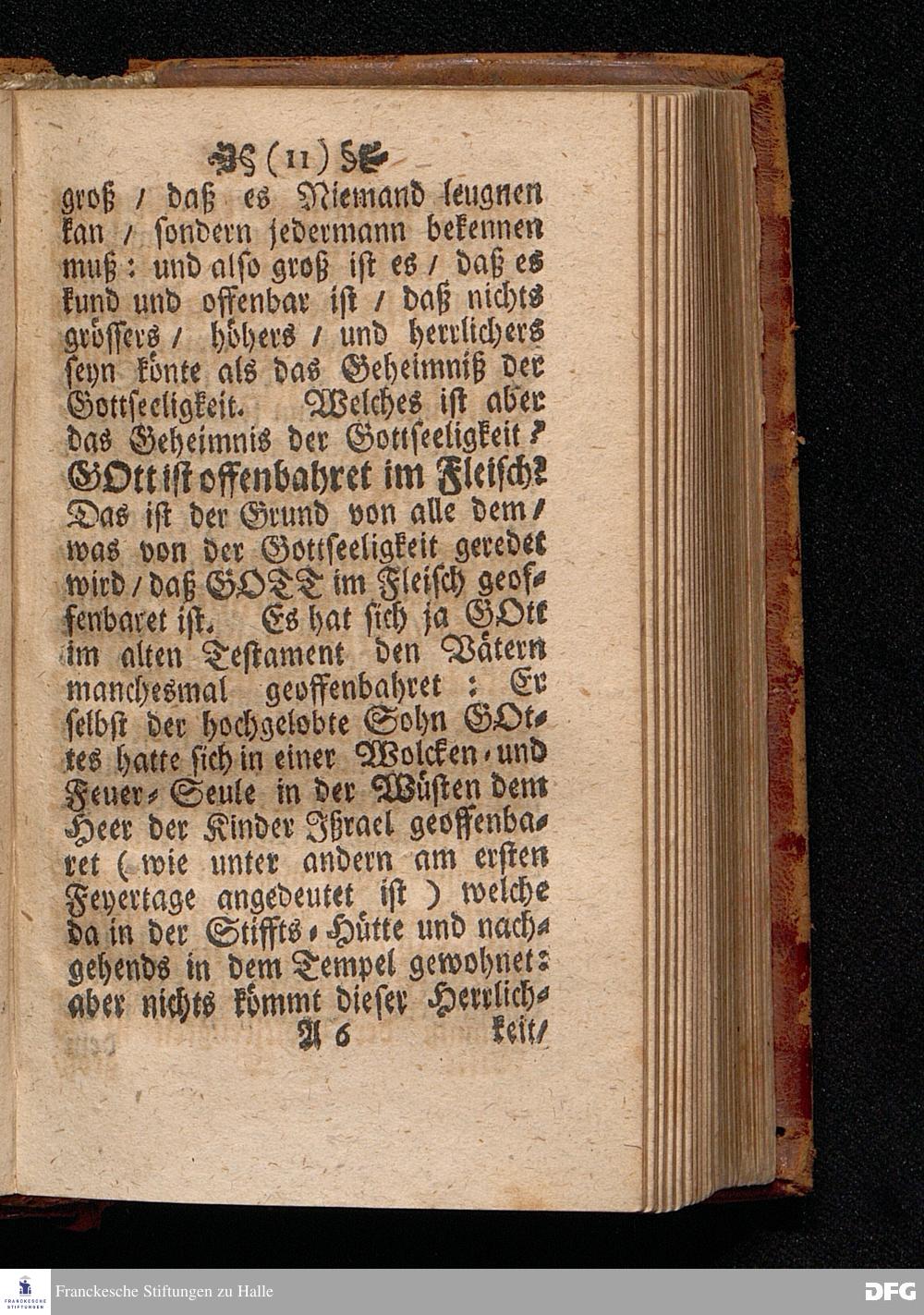 Das Kündlich=grosse Geheimniß Der Gottseeligkeit / Am dritten Weyhenacht=Feyertage ANNO 1698. In einer Predigt Uber das Evangelium Joh.I, 1--14. In der St. Georgen=Kirche zu Glaucha an Halle / vorgestellet von M.August Hermann Francken / S.S.Theol.P.P.Ord.& P.Glauch. HALLE / Gedruckt bey Christoph Salfelden / Königl.Preuß.Hoff-u.Reg.Buchd. 1702