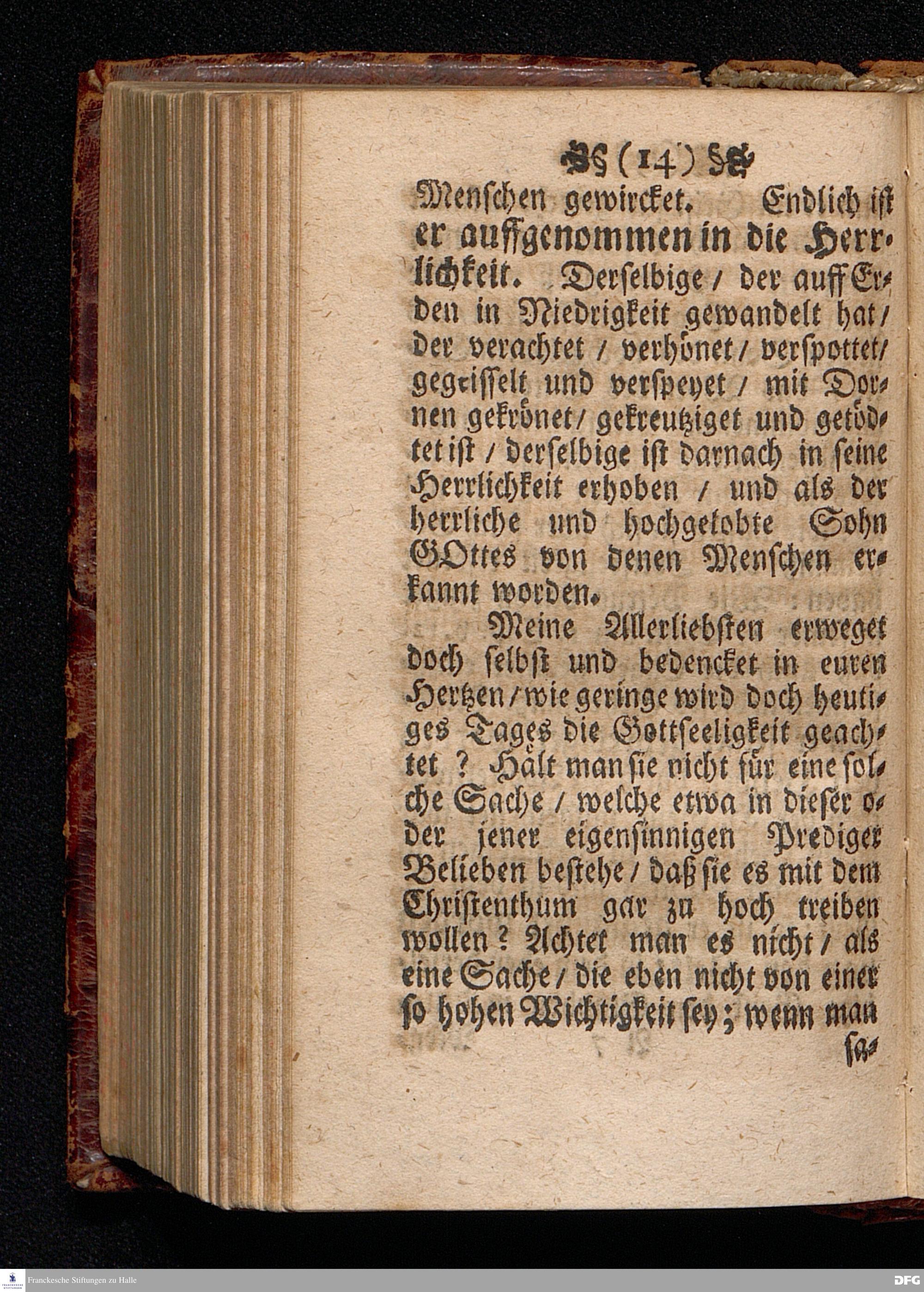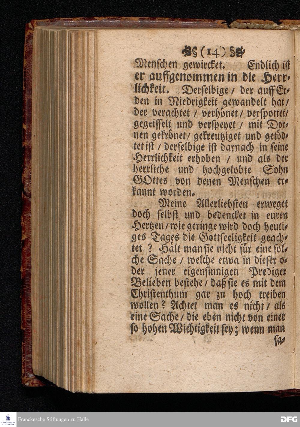 Das Kündlich=grosse Geheimniß Der Gottseeligkeit / Am dritten Weyhenacht=Feyertage ANNO 1698. In einer Predigt Uber das Evangelium Joh.I, 1--14. In der St. Georgen=Kirche zu Glaucha an Halle / vorgestellet von M.August Hermann Francken / S.S.Theol.P.P.Ord.& P.Glauch. HALLE / Gedruckt bey Christoph Salfelden / Königl.Preuß.Hoff-u.Reg.Buchd. 1702