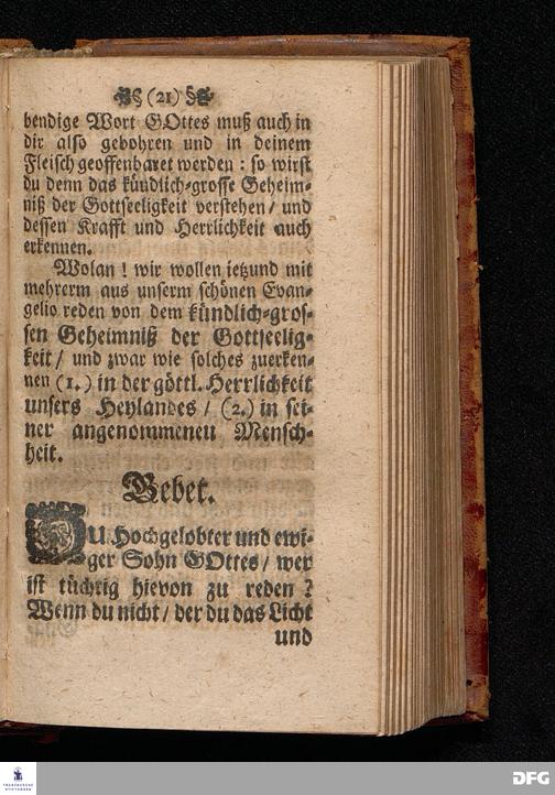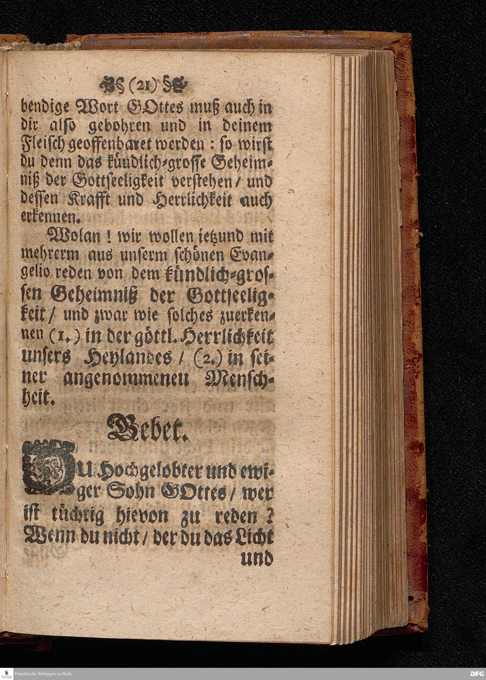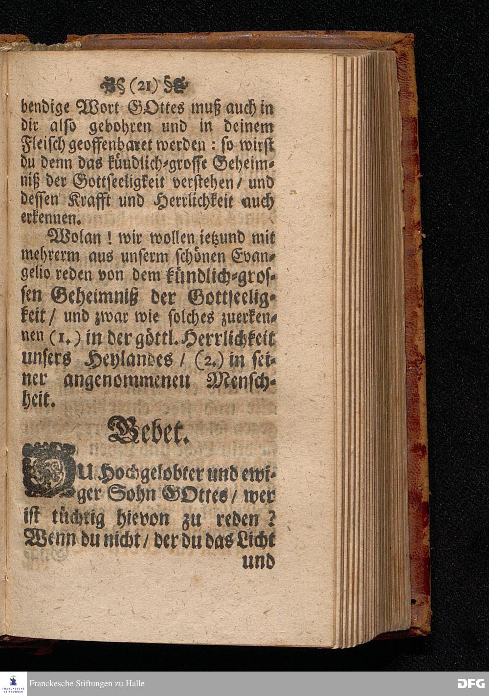 Das Kündlich=grosse Geheimniß Der Gottseeligkeit / Am dritten Weyhenacht=Feyertage ANNO 1698. In einer Predigt Uber das Evangelium Joh.I, 1--14. In der St. Georgen=Kirche zu Glaucha an Halle / vorgestellet von M.August Hermann Francken / S.S.Theol.P.P.Ord.& P.Glauch. HALLE / Gedruckt bey Christoph Salfelden / Königl.Preuß.Hoff-u.Reg.Buchd. 1702