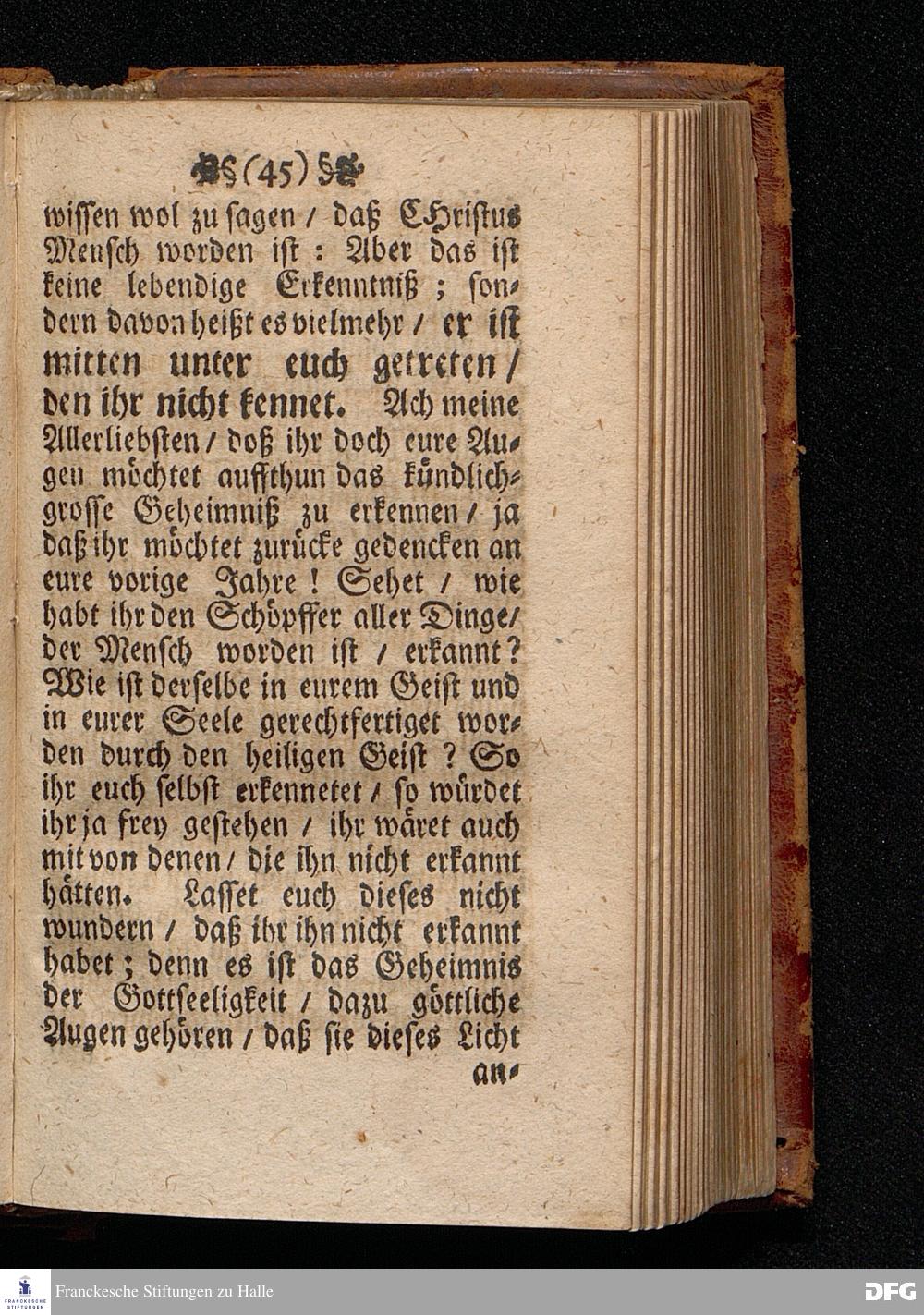 Das Kündlich=grosse Geheimniß Der Gottseeligkeit / Am dritten Weyhenacht=Feyertage ANNO 1698. In einer Predigt Uber das Evangelium Joh.I, 1--14. In der St. Georgen=Kirche zu Glaucha an Halle / vorgestellet von M.August Hermann Francken / S.S.Theol.P.P.Ord.& P.Glauch. HALLE / Gedruckt bey Christoph Salfelden / Königl.Preuß.Hoff-u.Reg.Buchd. 1702