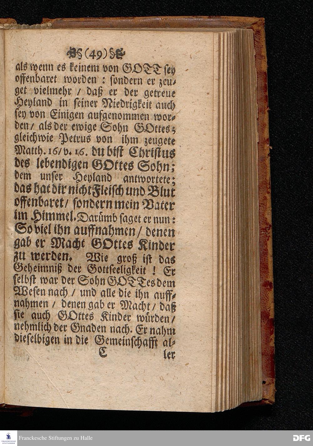 Das Kündlich=grosse Geheimniß Der Gottseeligkeit / Am dritten Weyhenacht=Feyertage ANNO 1698. In einer Predigt Uber das Evangelium Joh.I, 1--14. In der St. Georgen=Kirche zu Glaucha an Halle / vorgestellet von M.August Hermann Francken / S.S.Theol.P.P.Ord.& P.Glauch. HALLE / Gedruckt bey Christoph Salfelden / Königl.Preuß.Hoff-u.Reg.Buchd. 1702