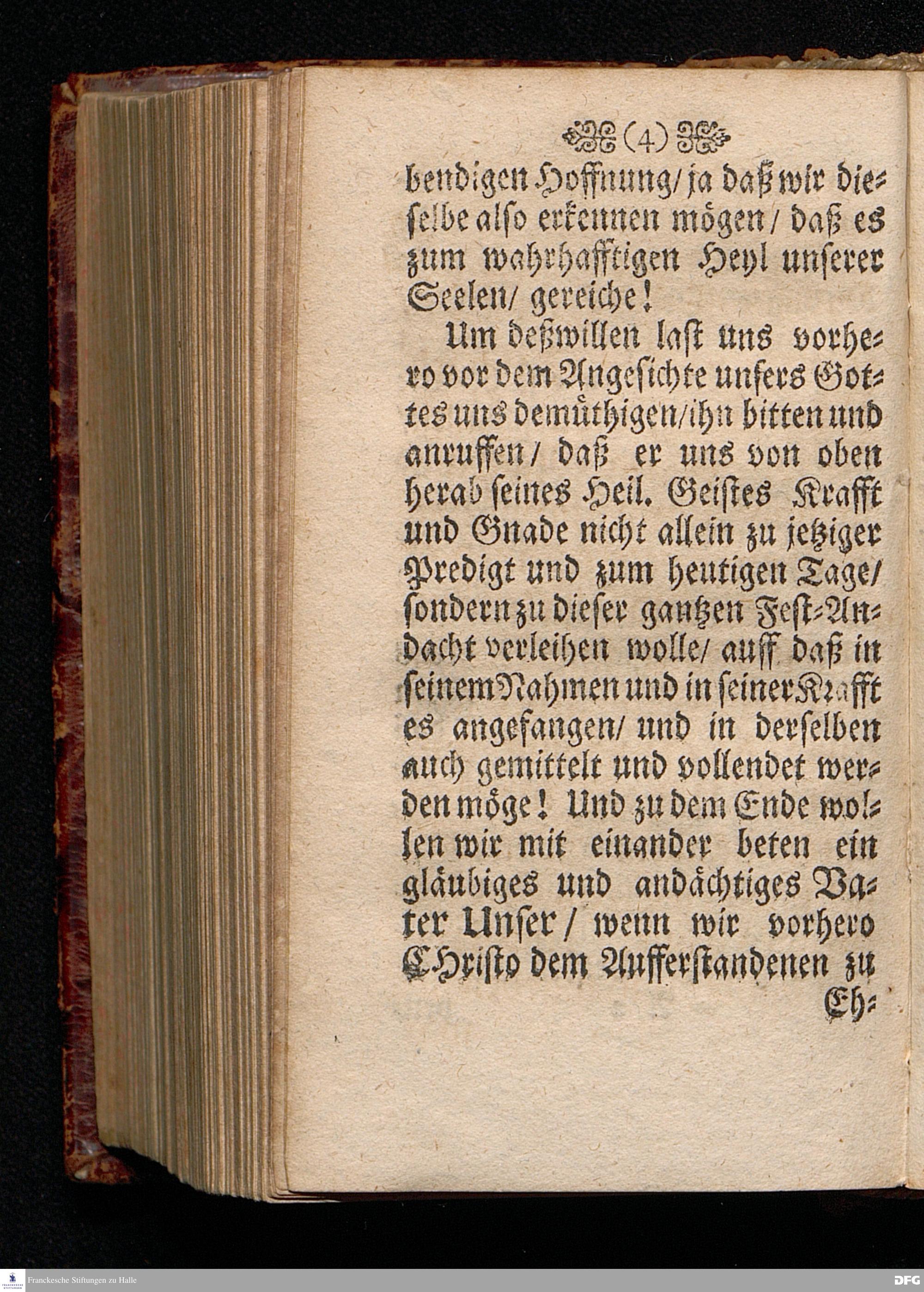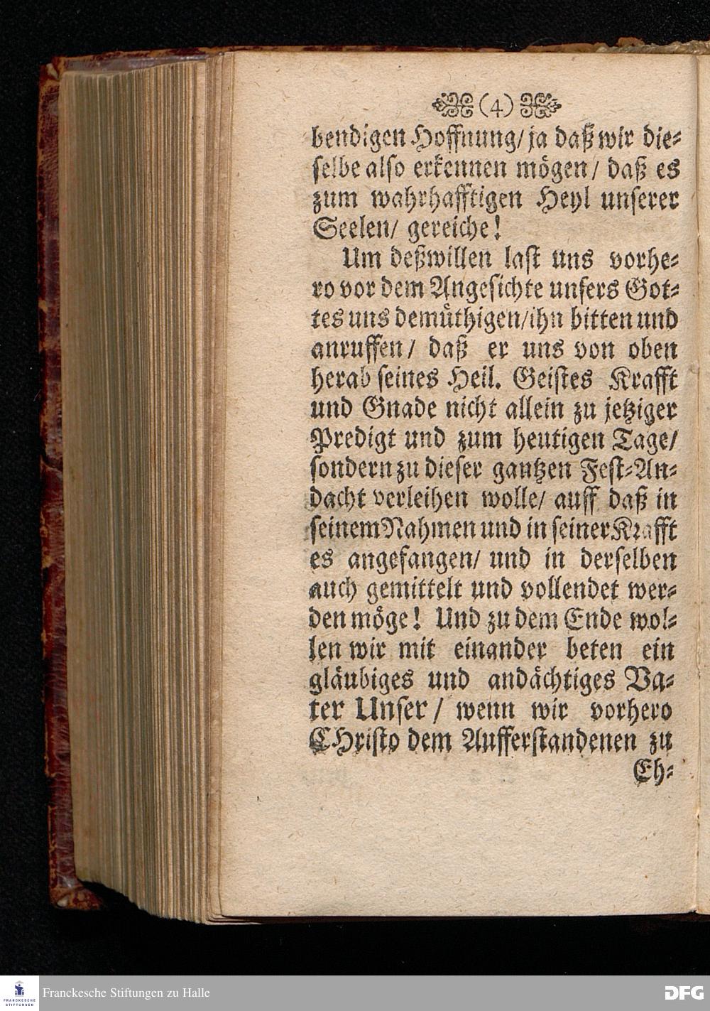 Das Lebendige Gedächtniß der Aufferstehung JESU CHristi; Am ersten Oster=Feyer=Tage über das Evangelium Marc. XVI. 1==8. In der St.Georgen=Kirche zu Glaucha an Halle MDCCI. vorgestellet / von August Hermann Francken / SS.Theol.PP.Ordin. & Past.Glauch. Halle / Druckts Joh.Grunert / U.B.
