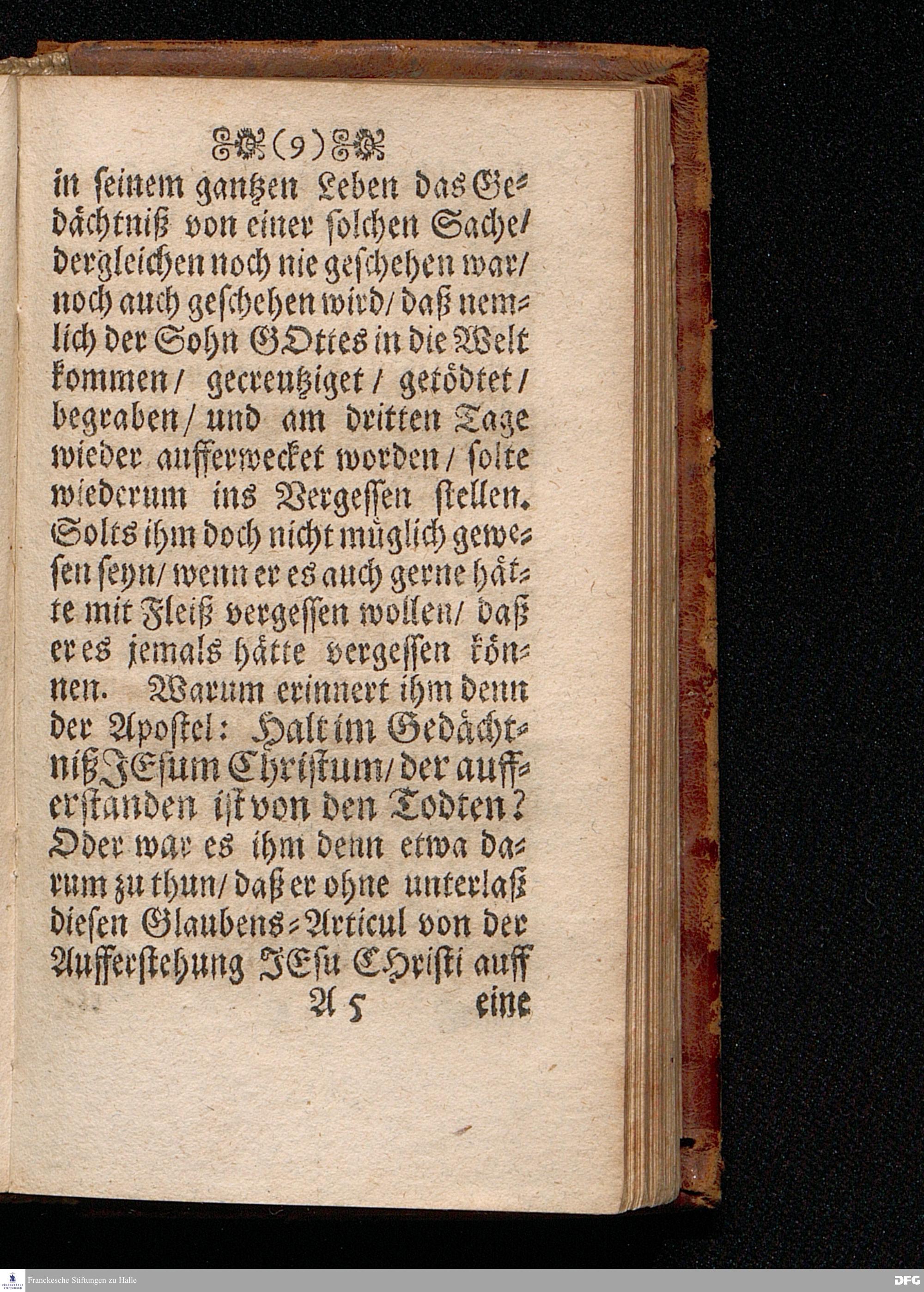 Das Lebendige Gedächtniß der Aufferstehung JESU CHristi; Am ersten Oster=Feyer=Tage über das Evangelium Marc. XVI. 1==8. In der St.Georgen=Kirche zu Glaucha an Halle MDCCI. vorgestellet / von August Hermann Francken / SS.Theol.PP.Ordin. & Past.Glauch. Halle / Druckts Joh.Grunert / U.B.