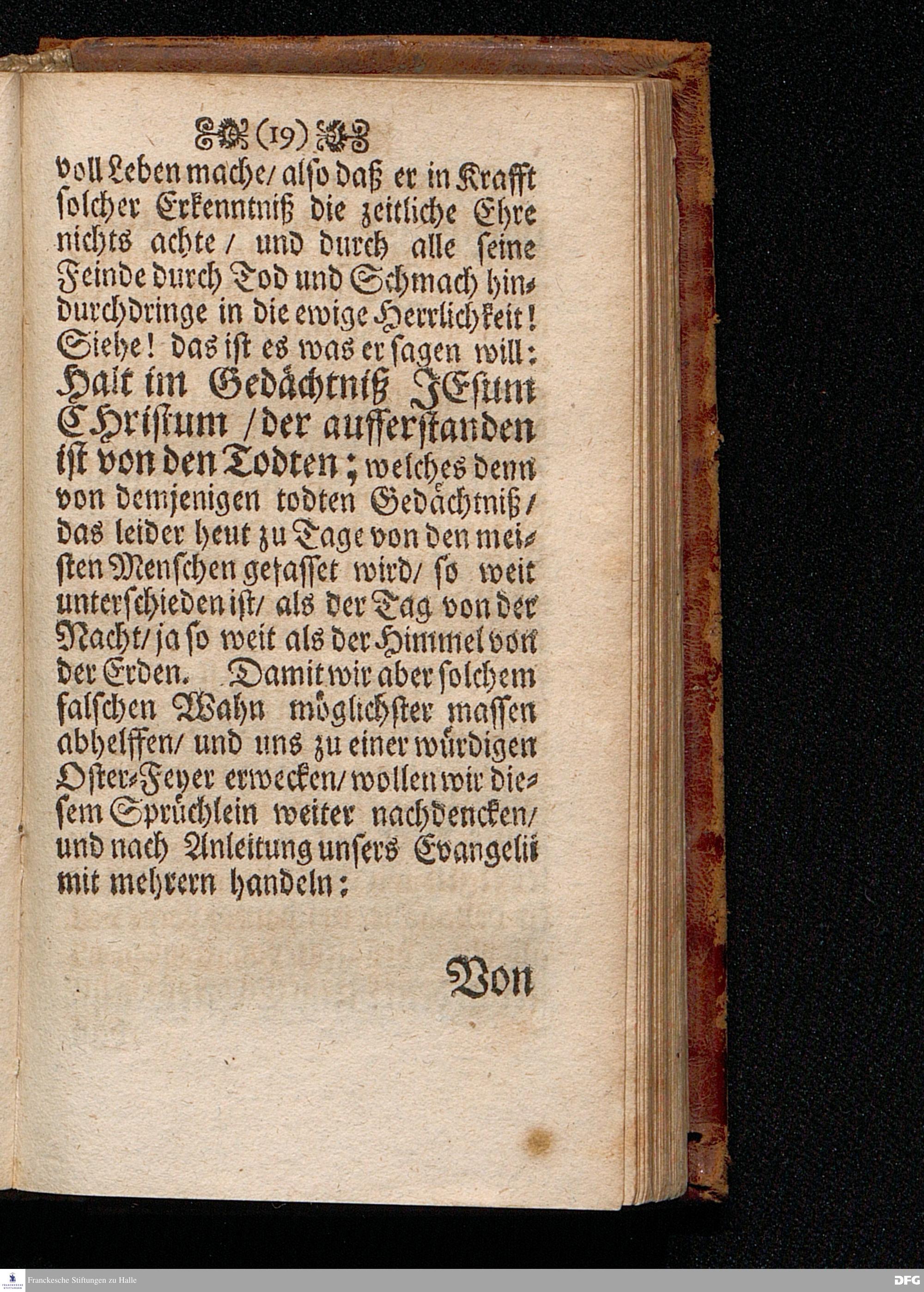 Das Lebendige Gedächtniß der Aufferstehung JESU CHristi; Am ersten Oster=Feyer=Tage über das Evangelium Marc. XVI. 1==8. In der St.Georgen=Kirche zu Glaucha an Halle MDCCI. vorgestellet / von August Hermann Francken / SS.Theol.PP.Ordin. & Past.Glauch. Halle / Druckts Joh.Grunert / U.B.