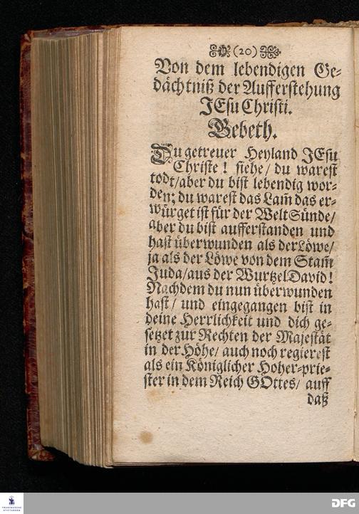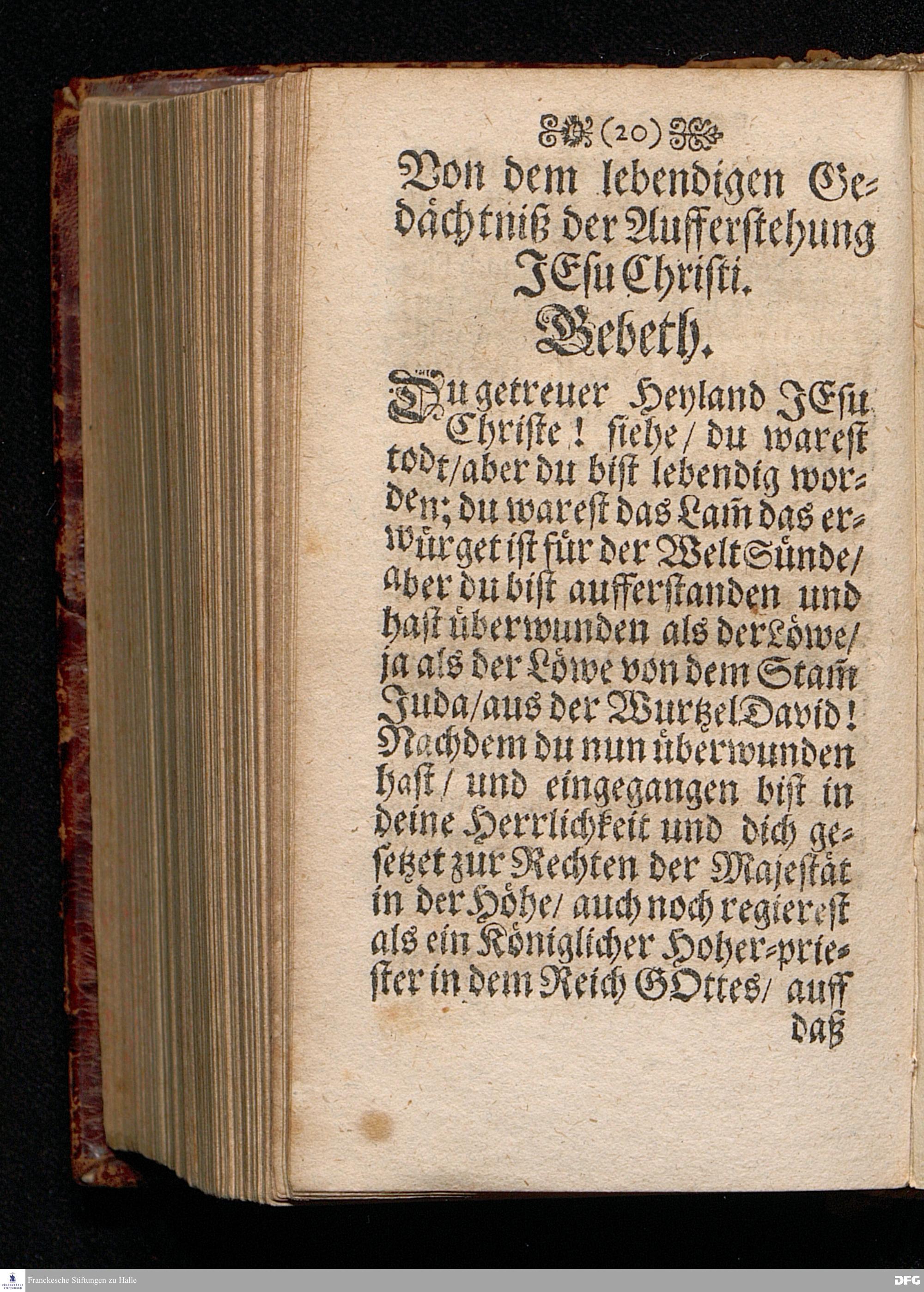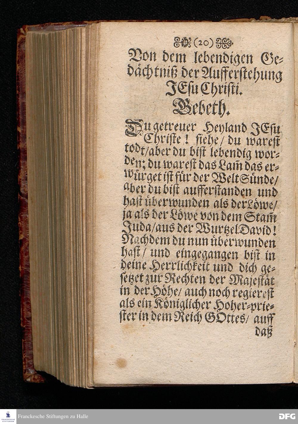 Das Lebendige Gedächtniß der Aufferstehung JESU CHristi; Am ersten Oster=Feyer=Tage über das Evangelium Marc. XVI. 1==8. In der St.Georgen=Kirche zu Glaucha an Halle MDCCI. vorgestellet / von August Hermann Francken / SS.Theol.PP.Ordin. & Past.Glauch. Halle / Druckts Joh.Grunert / U.B.