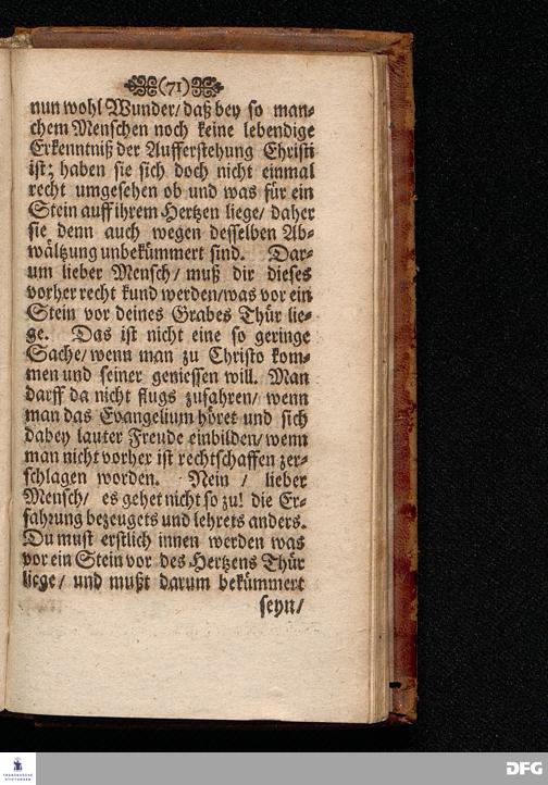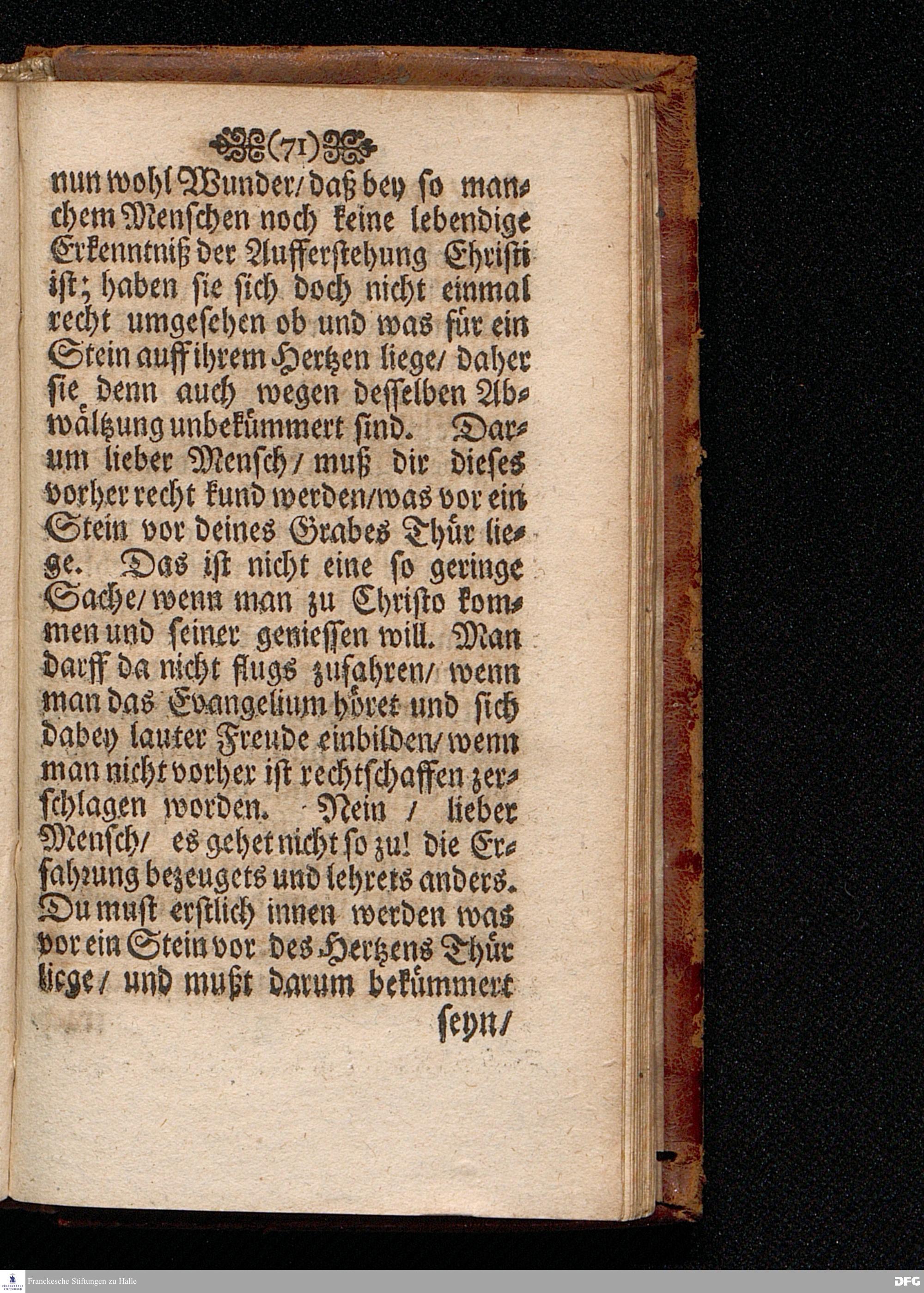 Das Lebendige Gedächtniß der Aufferstehung JESU CHristi; Am ersten Oster=Feyer=Tage über das Evangelium Marc. XVI. 1==8. In der St.Georgen=Kirche zu Glaucha an Halle MDCCI. vorgestellet / von August Hermann Francken / SS.Theol.PP.Ordin. & Past.Glauch. Halle / Druckts Joh.Grunert / U.B.
