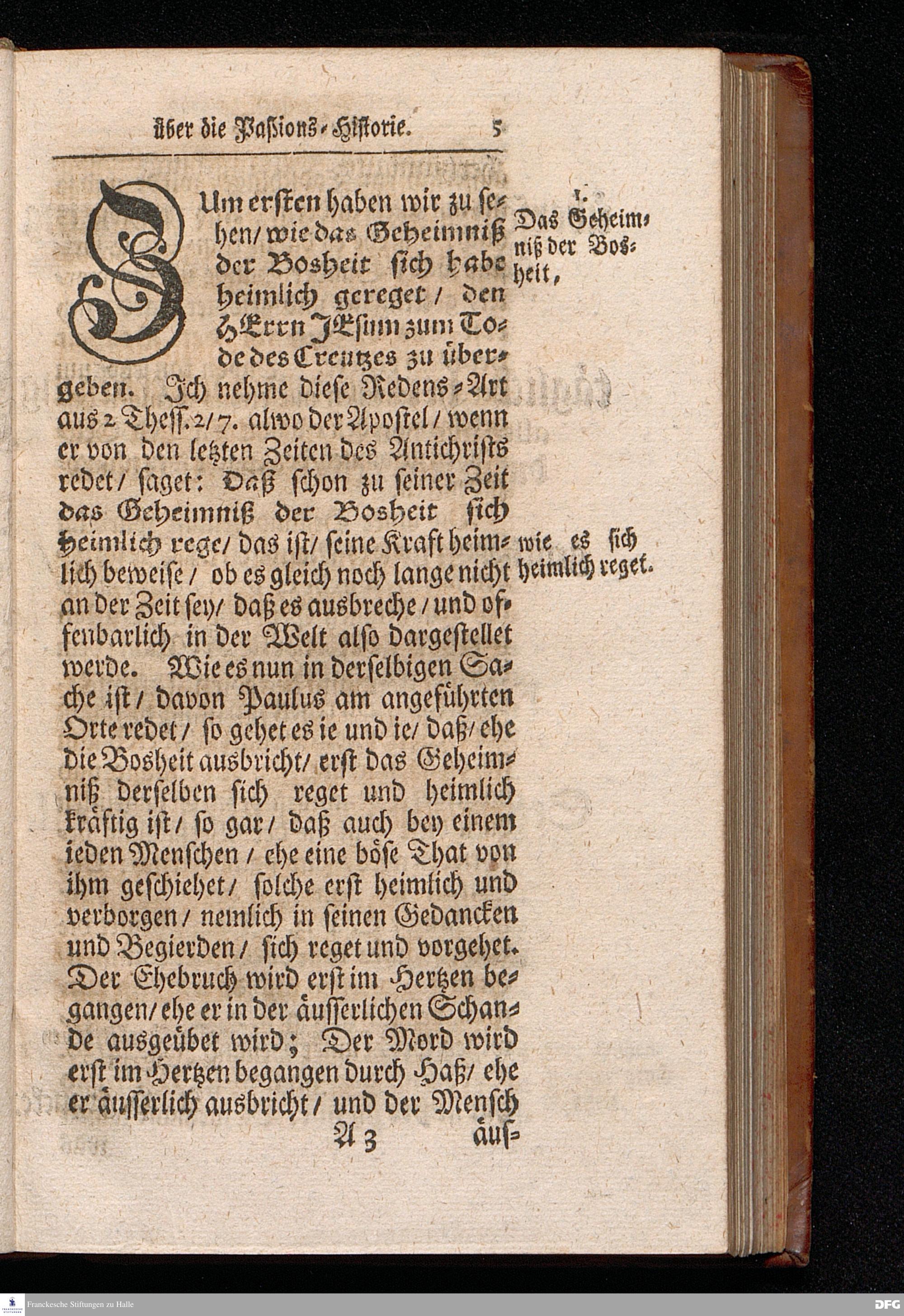 August Hermann Franckens S.Theol.Prof.Ord.und Past. Oeffentliche Reden über die Paßions=Historie / Wie dieselbe vom Evangelisten Marco im 14. und 15. Cap. beschrieben ist / gehalten Von Esto mihi bis Ostern 1712. In dem Wäysenhause zu Glaucha an Halle. HALLE, Gedruckt und verlegt im Wäysenhause, MDCCXV.