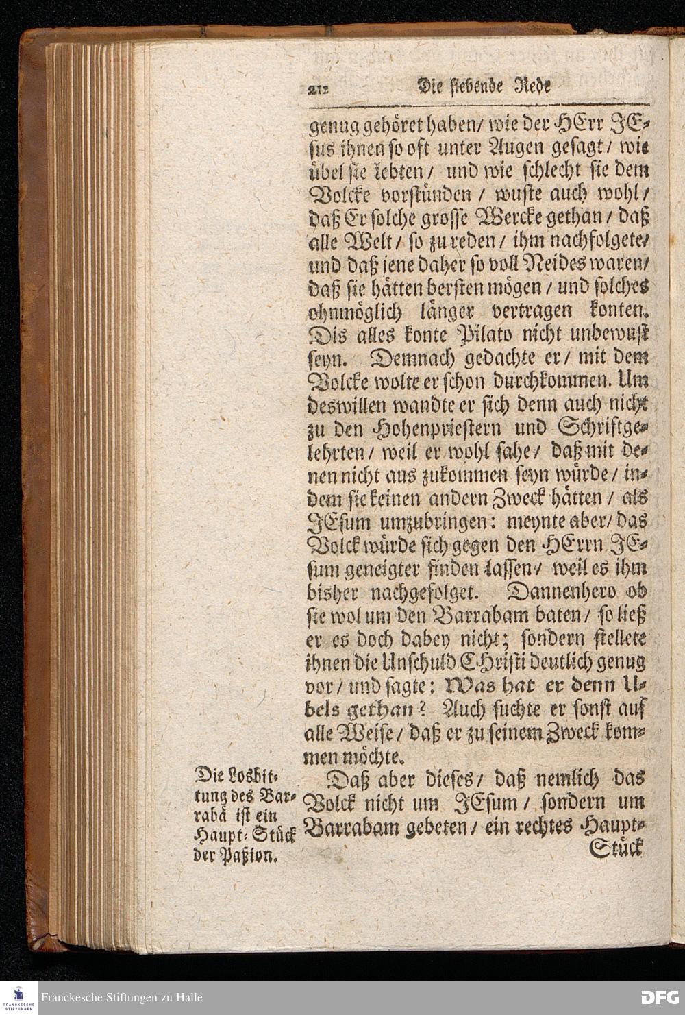 August Hermann Franckens S.Theol.Prof.Ord.und Past. Oeffentliche Reden über die Paßions=Historie / Wie dieselbe vom Evangelisten Marco im 14. und 15. Cap. beschrieben ist / gehalten Von Esto mihi bis Ostern 1712. In dem Wäysenhause zu Glaucha an Halle. HALLE, Gedruckt und verlegt im Wäysenhause, MDCCXV.