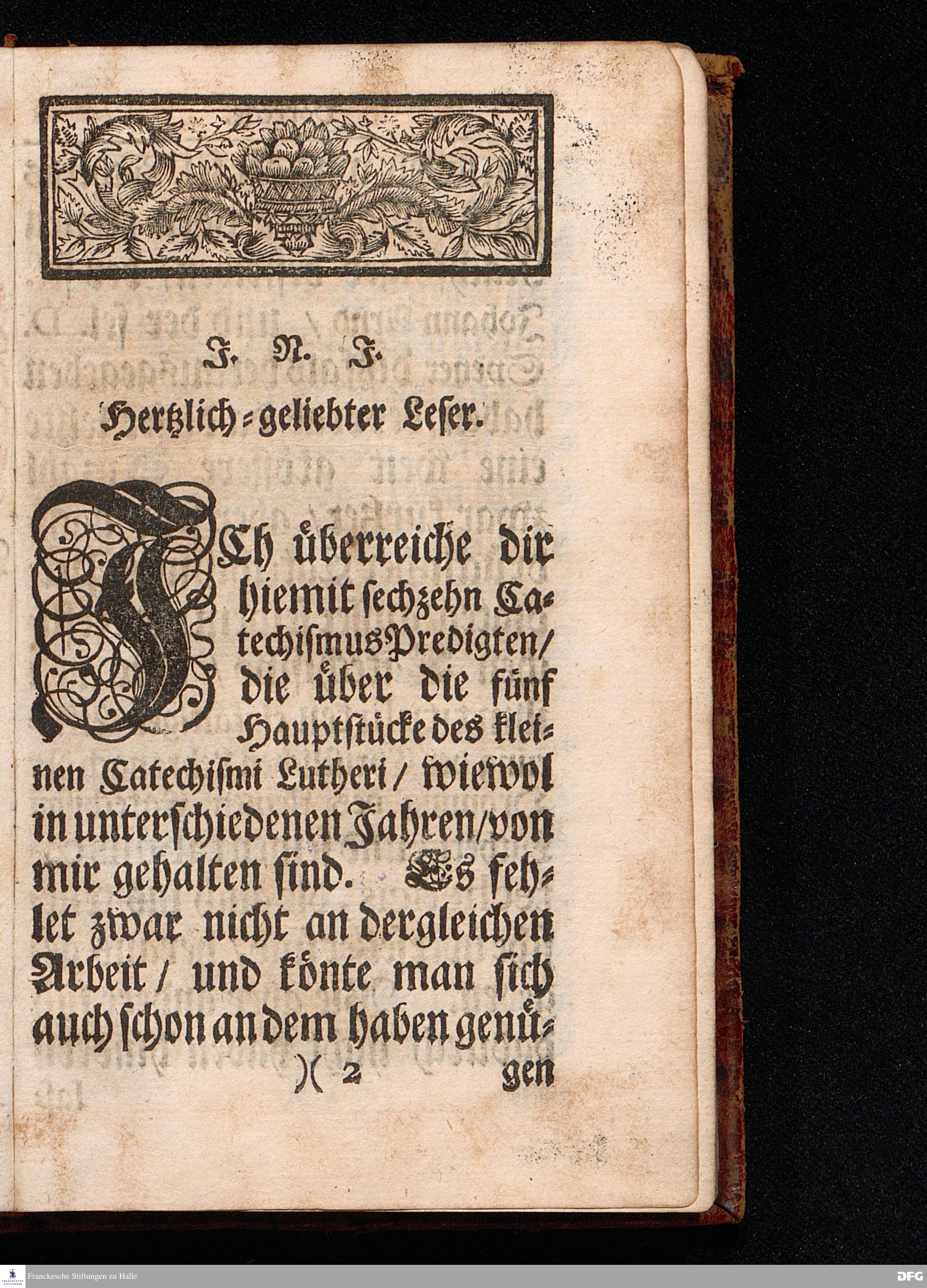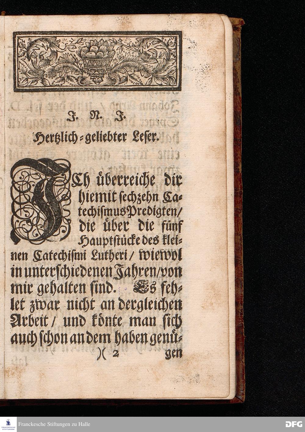 August Hermann Franckens / S.Th.Pr.Past.Vlr.& Schol. Catechismus = Predigten / Darinnen Die V.Hauptstücke des kleinen Catechismi Lutheri, zu gründlicher Erbauung im wahren thätigen Christenthum, abgehandelt sind, gehalten In der Kirche zur L.Frauen zu Halle / im Hertzogthum Magdeburg. Andere Auflage. HALLE, In Verlegung des Wäysenhauses, MDCCXXIX.