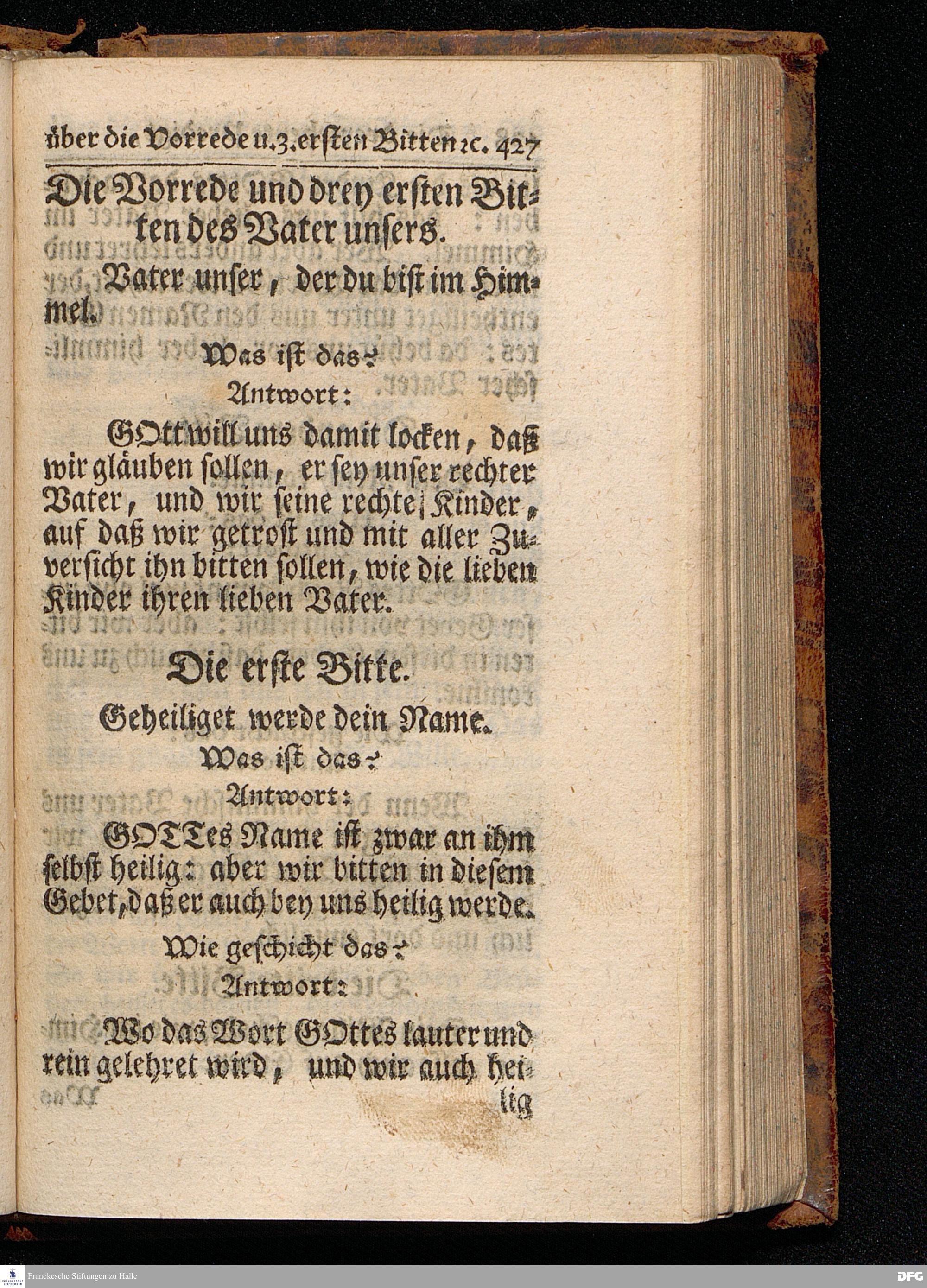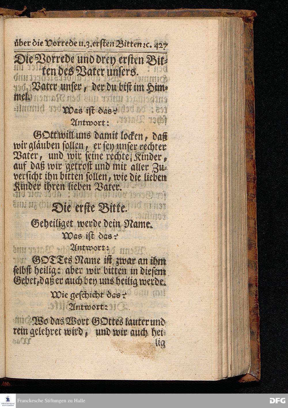 August Hermann Franckens / S.Th.Pr.Past.Vlr.& Schol. Catechismus = Predigten / Darinnen Die V.Hauptstücke des kleinen Catechismi Lutheri, zu gründlicher Erbauung im wahren thätigen Christenthum, abgehandelt sind, gehalten In der Kirche zur L.Frauen zu Halle / im Hertzogthum Magdeburg. Andere Auflage. HALLE, In Verlegung des Wäysenhauses, MDCCXXIX.