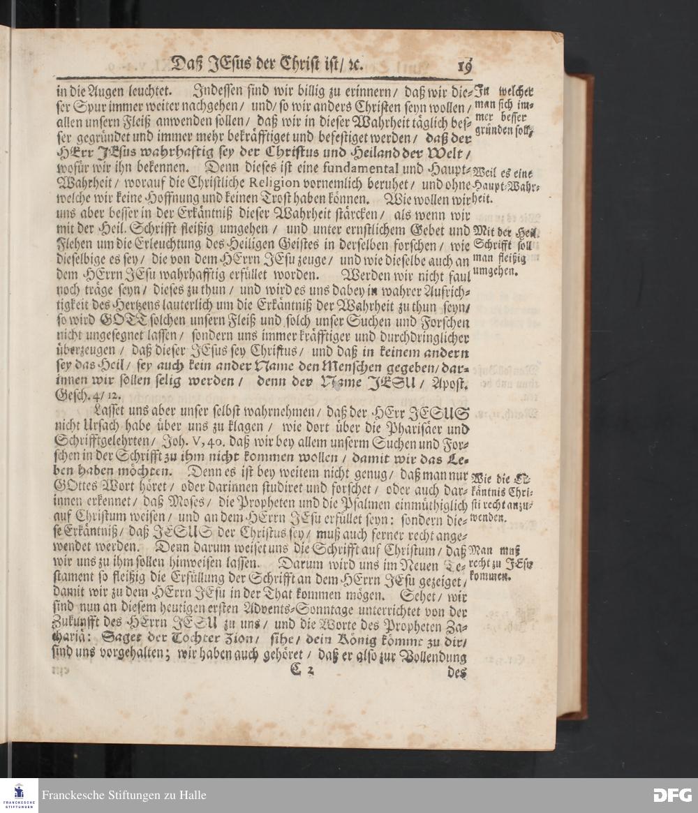 August Hermann Franckens S.Theol.Prof.und Past. Sonn= Fest= und Apostel=Tags=-Predigten / Darinnen Die zum wahren Christenthum gehörige nöthigste und vornehmste Materien abgehandelt sind; Nunmehro von neuen wieder durchgesehen / und mit einigen Predigten vermehret / Nebst den darzu nützlichen Registern. Die vierte EDITION. HALLE / gedruckt und verlegt im Wäysen=Hause / MDCCXV. Mit Königl.Preuß.und Churfl.Brandenb.Privil.