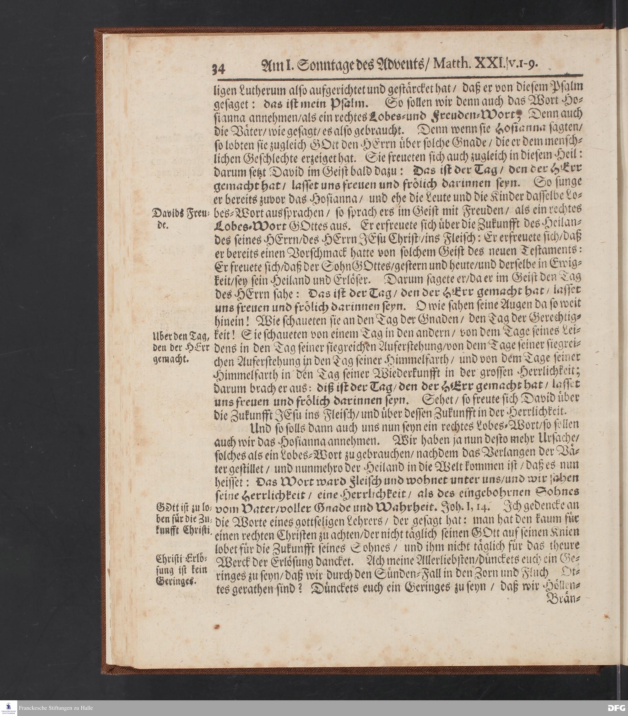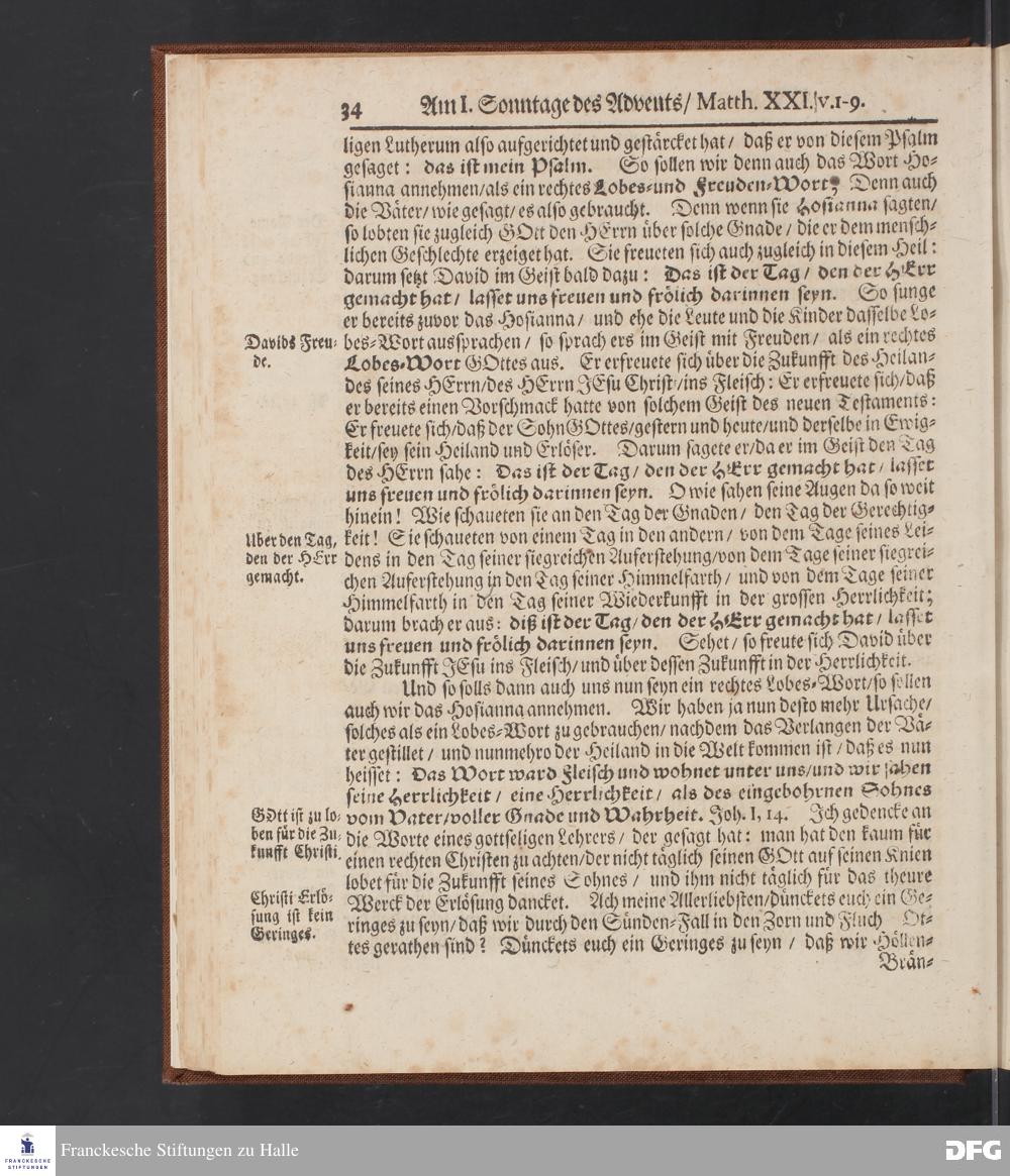 August Hermann Franckens S.Theol.Prof.und Past. Sonn= Fest= und Apostel=Tags=-Predigten / Darinnen Die zum wahren Christenthum gehörige nöthigste und vornehmste Materien abgehandelt sind; Nunmehro von neuen wieder durchgesehen / und mit einigen Predigten vermehret / Nebst den darzu nützlichen Registern. Die vierte EDITION. HALLE / gedruckt und verlegt im Wäysen=Hause / MDCCXV. Mit Königl.Preuß.und Churfl.Brandenb.Privil.