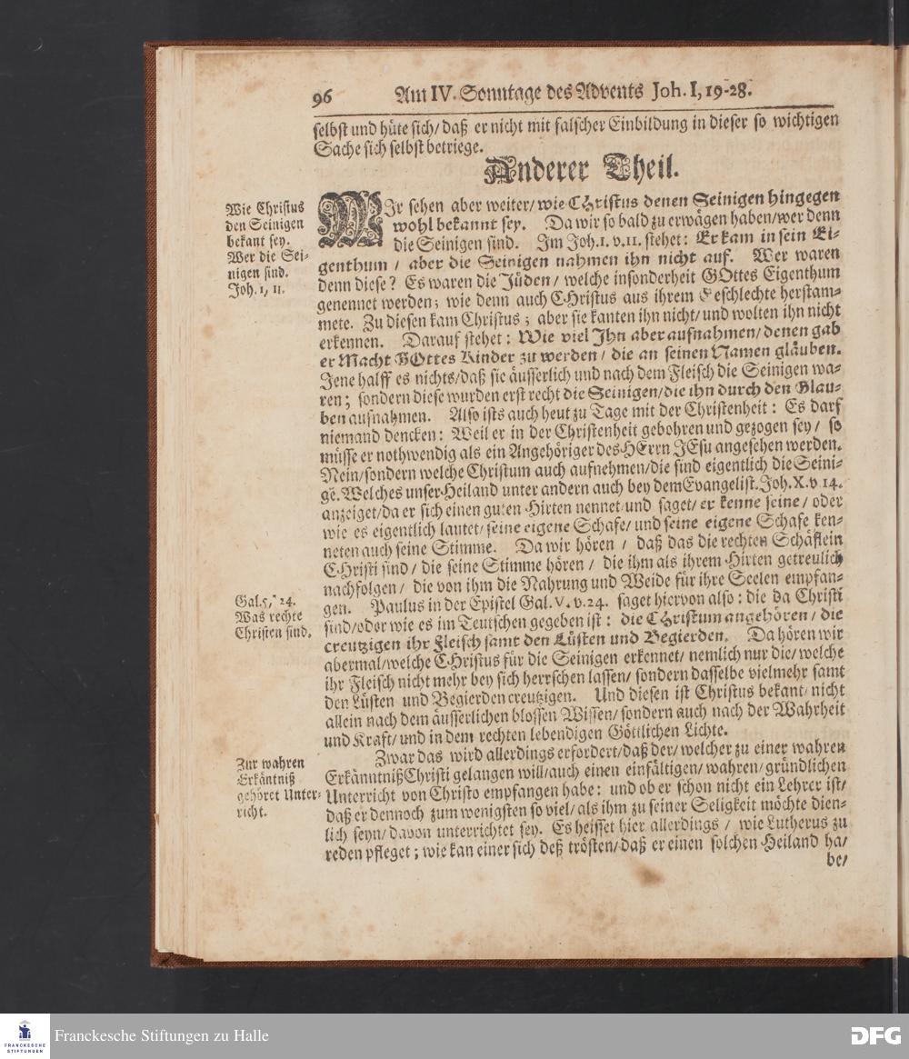 August Hermann Franckens S.Theol.Prof.und Past. Sonn= Fest= und Apostel=Tags=-Predigten / Darinnen Die zum wahren Christenthum gehörige nöthigste und vornehmste Materien abgehandelt sind; Nunmehro von neuen wieder durchgesehen / und mit einigen Predigten vermehret / Nebst den darzu nützlichen Registern. Die vierte EDITION. HALLE / gedruckt und verlegt im Wäysen=Hause / MDCCXV. Mit Königl.Preuß.und Churfl.Brandenb.Privil.