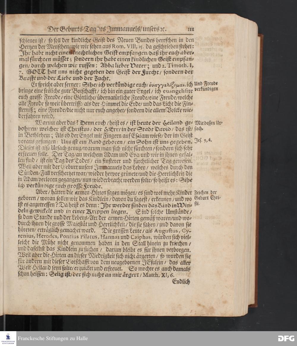August Hermann Franckens S.Theol.Prof.und Past. Sonn= Fest= und Apostel=Tags=-Predigten / Darinnen Die zum wahren Christenthum gehörige nöthigste und vornehmste Materien abgehandelt sind; Nunmehro von neuen wieder durchgesehen / und mit einigen Predigten vermehret / Nebst den darzu nützlichen Registern. Die vierte EDITION. HALLE / gedruckt und verlegt im Wäysen=Hause / MDCCXV. Mit Königl.Preuß.und Churfl.Brandenb.Privil.