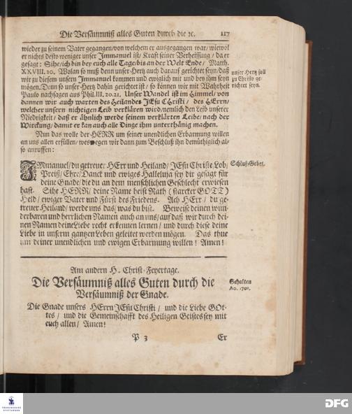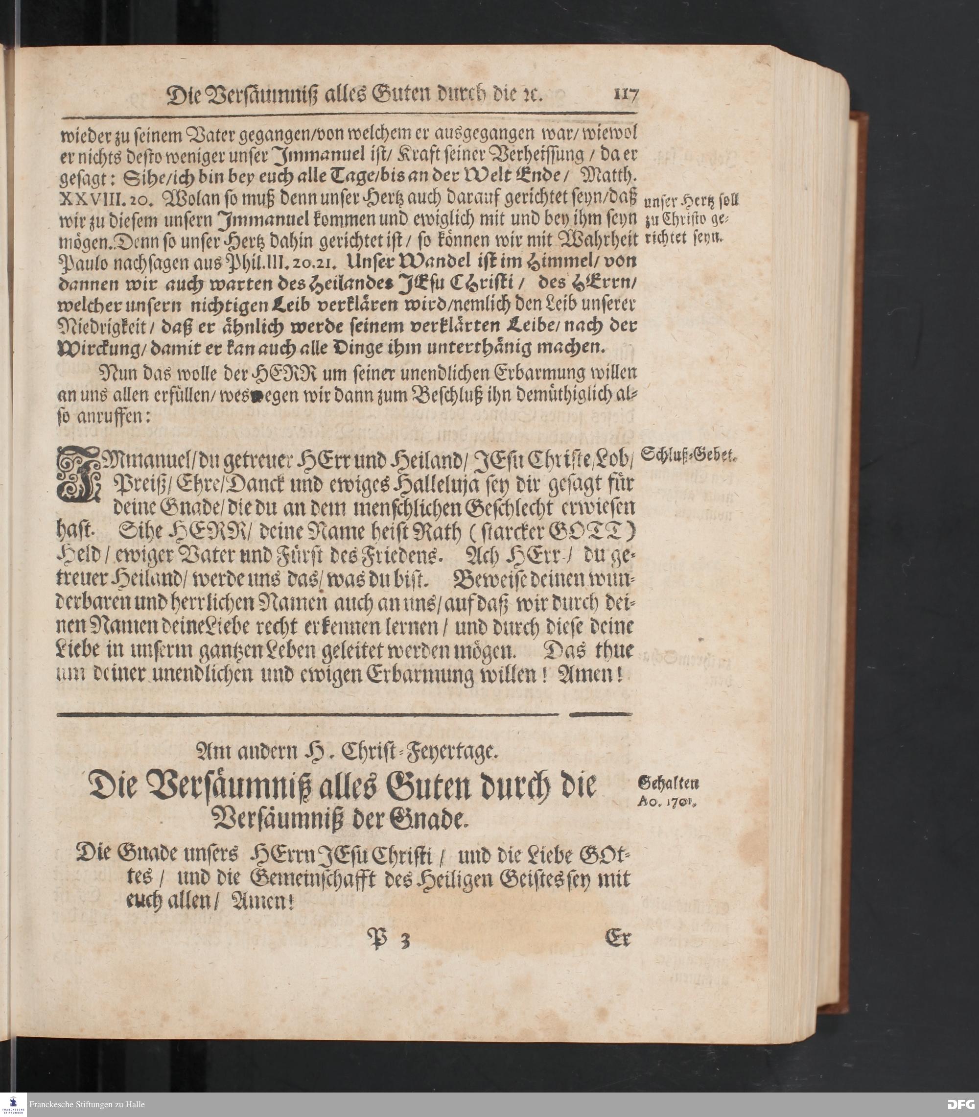 August Hermann Franckens S.Theol.Prof.und Past. Sonn= Fest= und Apostel=Tags=-Predigten / Darinnen Die zum wahren Christenthum gehörige nöthigste und vornehmste Materien abgehandelt sind; Nunmehro von neuen wieder durchgesehen / und mit einigen Predigten vermehret / Nebst den darzu nützlichen Registern. Die vierte EDITION. HALLE / gedruckt und verlegt im Wäysen=Hause / MDCCXV. Mit Königl.Preuß.und Churfl.Brandenb.Privil.