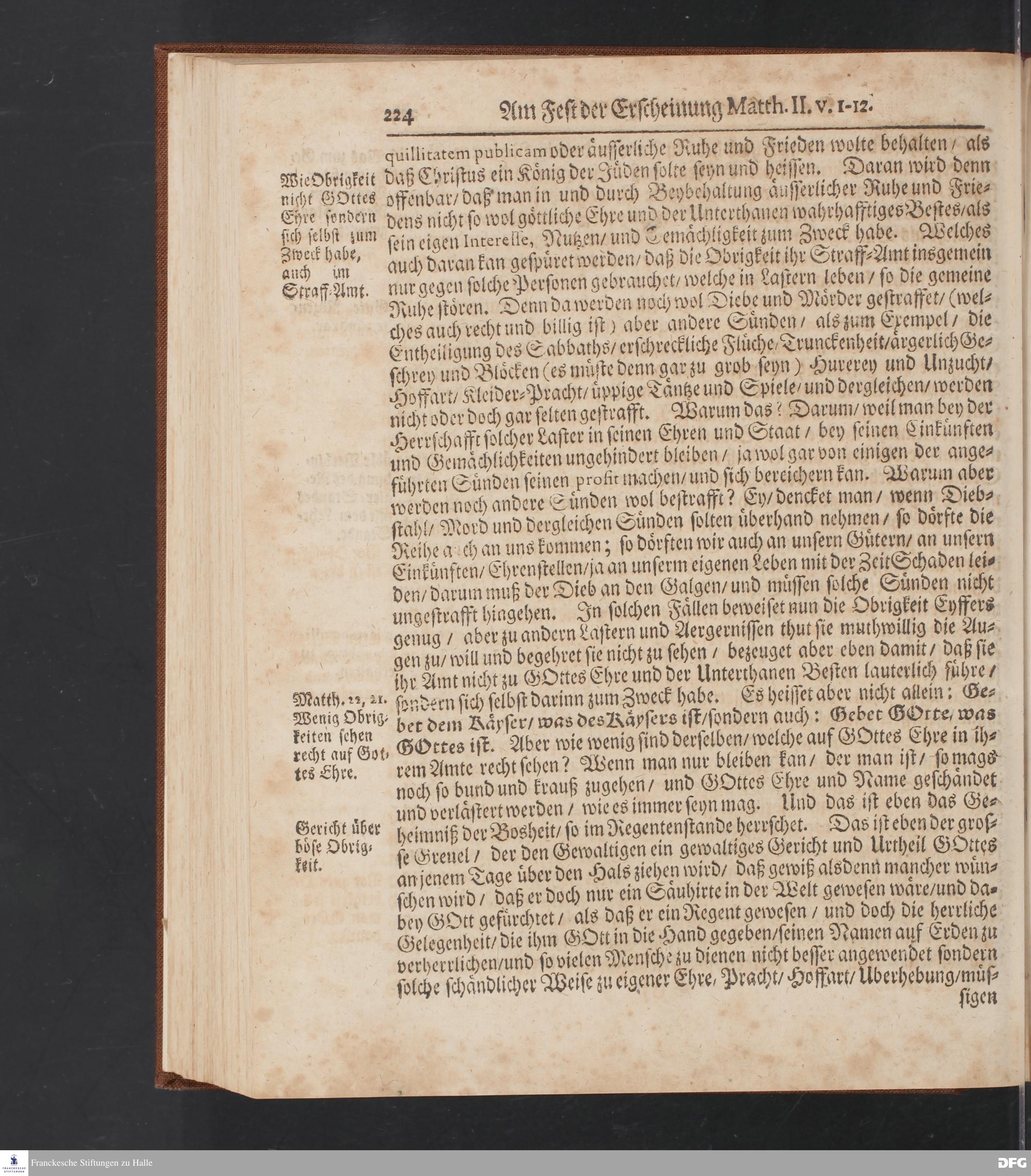 August Hermann Franckens S.Theol.Prof.und Past. Sonn= Fest= und Apostel=Tags=-Predigten / Darinnen Die zum wahren Christenthum gehörige nöthigste und vornehmste Materien abgehandelt sind; Nunmehro von neuen wieder durchgesehen / und mit einigen Predigten vermehret / Nebst den darzu nützlichen Registern. Die vierte EDITION. HALLE / gedruckt und verlegt im Wäysen=Hause / MDCCXV. Mit Königl.Preuß.und Churfl.Brandenb.Privil.