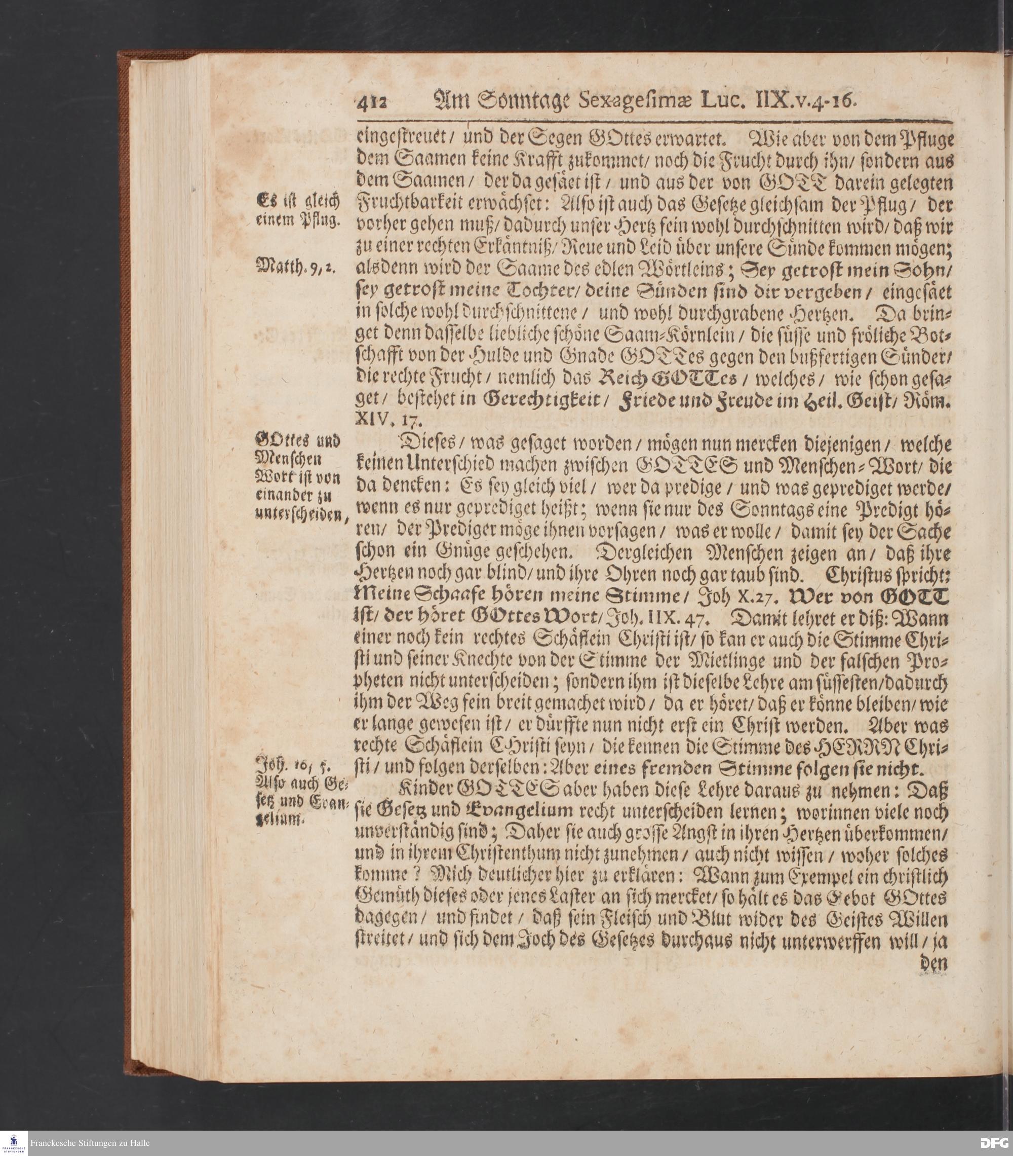 August Hermann Franckens S.Theol.Prof.und Past. Sonn= Fest= und Apostel=Tags=-Predigten / Darinnen Die zum wahren Christenthum gehörige nöthigste und vornehmste Materien abgehandelt sind; Nunmehro von neuen wieder durchgesehen / und mit einigen Predigten vermehret / Nebst den darzu nützlichen Registern. Die vierte EDITION. HALLE / gedruckt und verlegt im Wäysen=Hause / MDCCXV. Mit Königl.Preuß.und Churfl.Brandenb.Privil.
