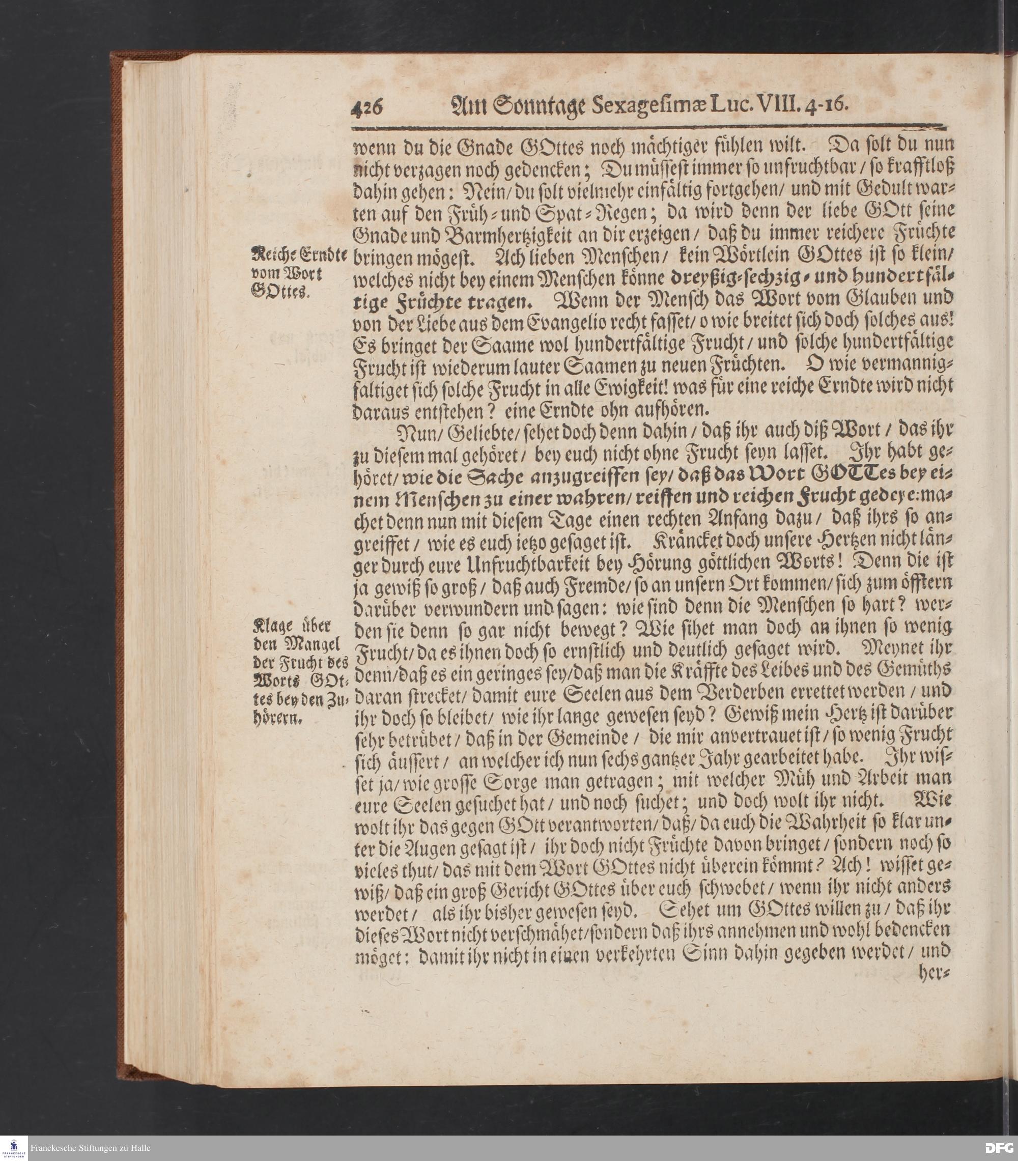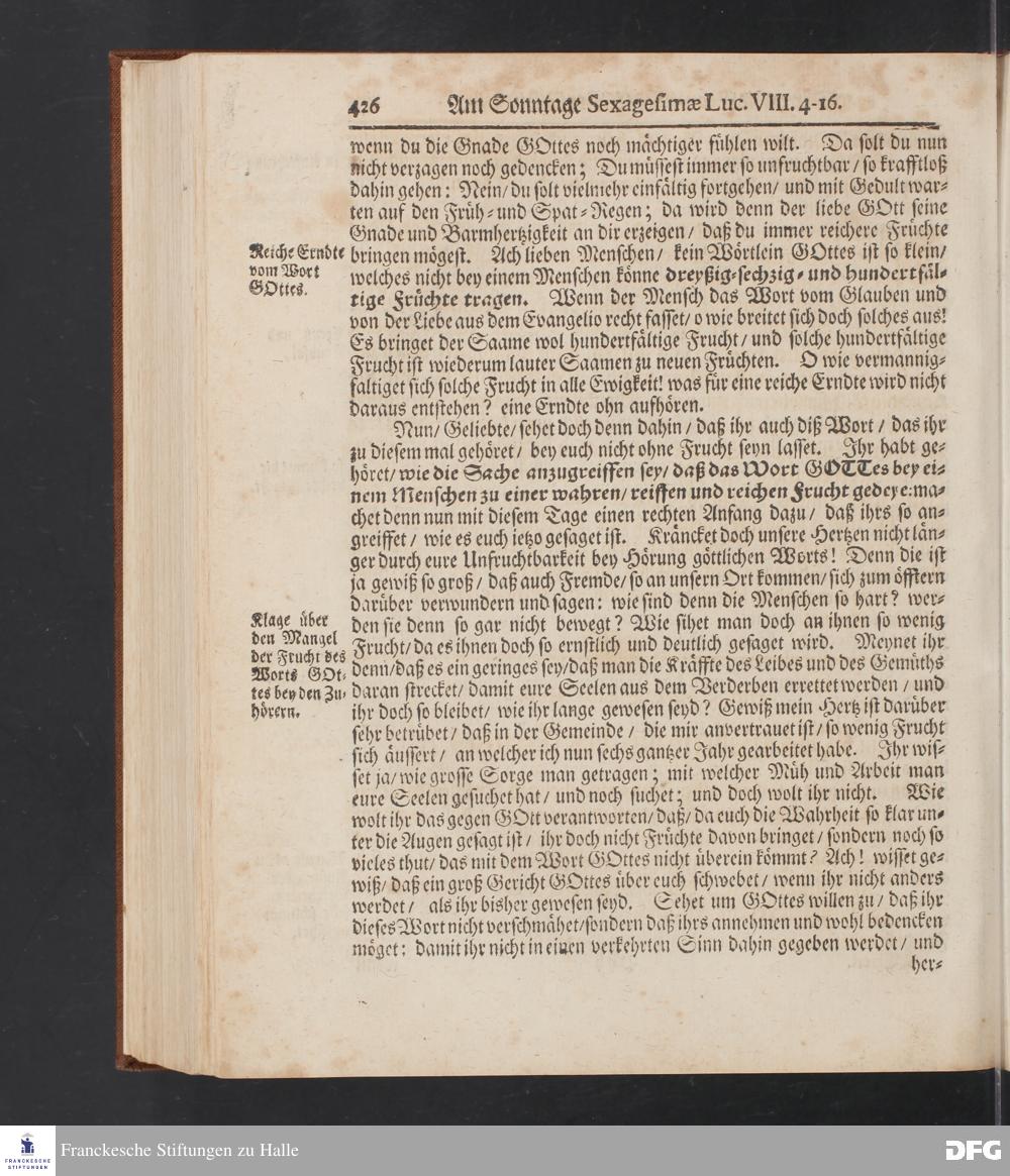 August Hermann Franckens S.Theol.Prof.und Past. Sonn= Fest= und Apostel=Tags=-Predigten / Darinnen Die zum wahren Christenthum gehörige nöthigste und vornehmste Materien abgehandelt sind; Nunmehro von neuen wieder durchgesehen / und mit einigen Predigten vermehret / Nebst den darzu nützlichen Registern. Die vierte EDITION. HALLE / gedruckt und verlegt im Wäysen=Hause / MDCCXV. Mit Königl.Preuß.und Churfl.Brandenb.Privil.
