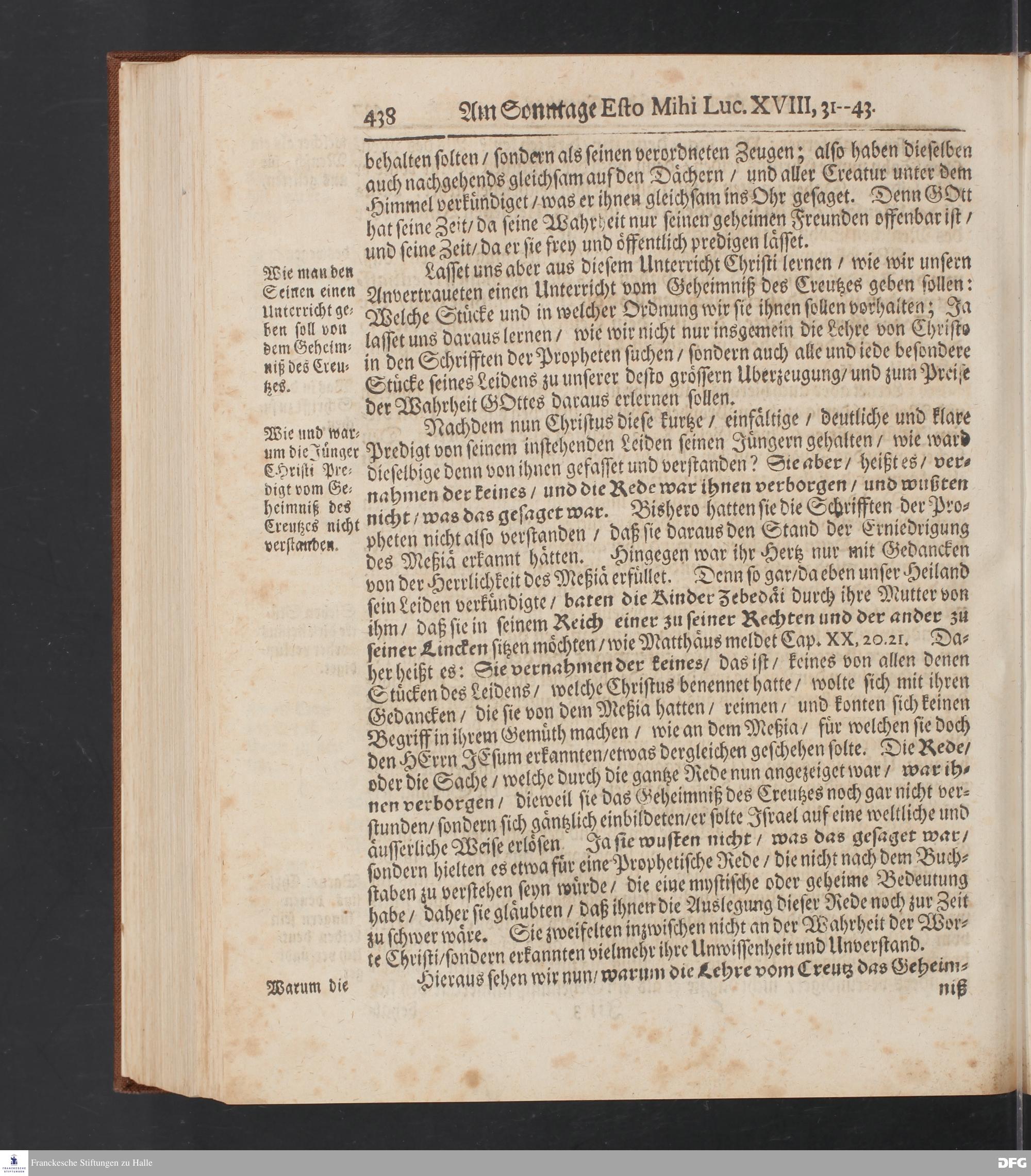 August Hermann Franckens S.Theol.Prof.und Past. Sonn= Fest= und Apostel=Tags=-Predigten / Darinnen Die zum wahren Christenthum gehörige nöthigste und vornehmste Materien abgehandelt sind; Nunmehro von neuen wieder durchgesehen / und mit einigen Predigten vermehret / Nebst den darzu nützlichen Registern. Die vierte EDITION. HALLE / gedruckt und verlegt im Wäysen=Hause / MDCCXV. Mit Königl.Preuß.und Churfl.Brandenb.Privil.