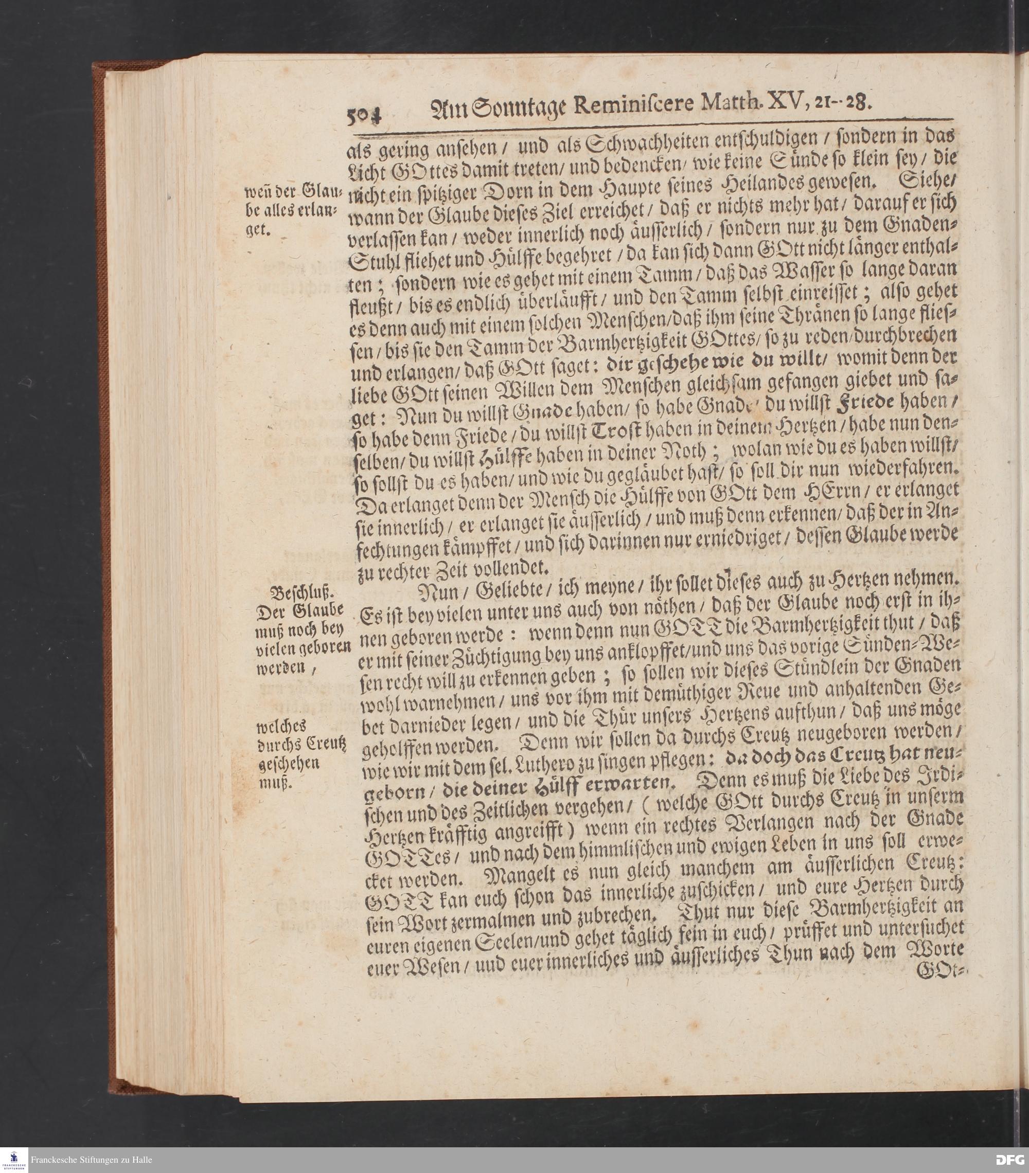 August Hermann Franckens S.Theol.Prof.und Past. Sonn= Fest= und Apostel=Tags=-Predigten / Darinnen Die zum wahren Christenthum gehörige nöthigste und vornehmste Materien abgehandelt sind; Nunmehro von neuen wieder durchgesehen / und mit einigen Predigten vermehret / Nebst den darzu nützlichen Registern. Die vierte EDITION. HALLE / gedruckt und verlegt im Wäysen=Hause / MDCCXV. Mit Königl.Preuß.und Churfl.Brandenb.Privil.