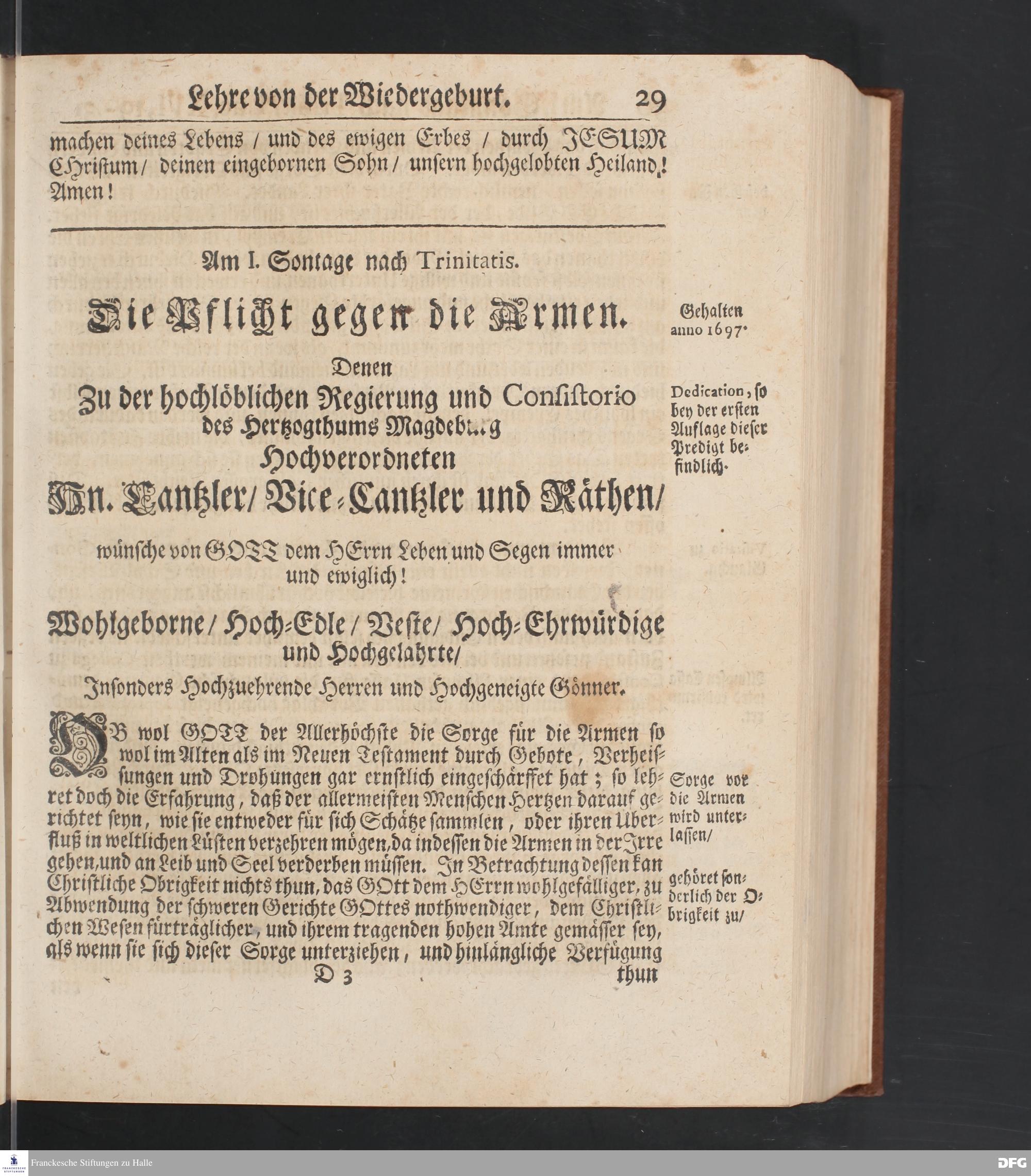 August Hermann Franckens S.Theol.Prof.und Past. Sonn= Fest= und Apostel=Tags=-Predigten / Darinnen Die zum wahren Christenthum gehörige nöthigste und vornehmste Materien abgehandelt sind; Nunmehro von neuen wieder durchgesehen / und mit einigen Predigten vermehret / Nebst den darzu nützlichen Registern. Die vierte EDITION. HALLE / gedruckt und verlegt im Wäysen=Hause / MDCCXV. Mit Königl.Preuß.und Churfl.Brandenb.Privil.
