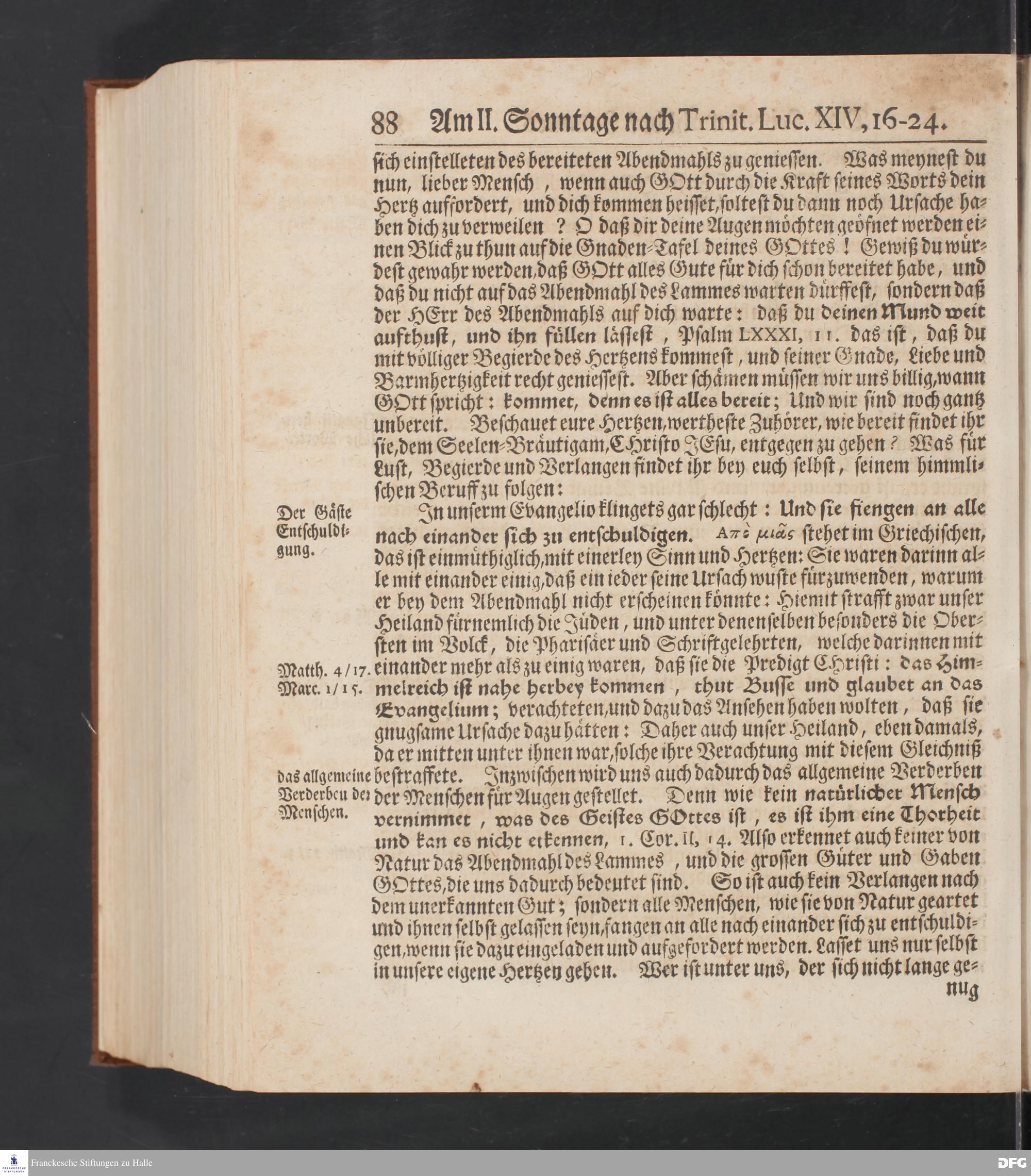 August Hermann Franckens S.Theol.Prof.und Past. Sonn= Fest= und Apostel=Tags=-Predigten / Darinnen Die zum wahren Christenthum gehörige nöthigste und vornehmste Materien abgehandelt sind; Nunmehro von neuen wieder durchgesehen / und mit einigen Predigten vermehret / Nebst den darzu nützlichen Registern. Die vierte EDITION. HALLE / gedruckt und verlegt im Wäysen=Hause / MDCCXV. Mit Königl.Preuß.und Churfl.Brandenb.Privil.