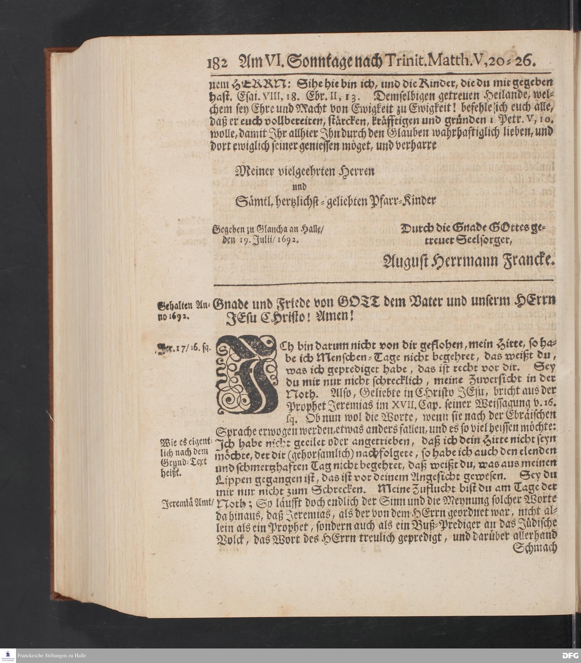 August Hermann Franckens S.Theol.Prof.und Past. Sonn= Fest= und Apostel=Tags=-Predigten / Darinnen Die zum wahren Christenthum gehörige nöthigste und vornehmste Materien abgehandelt sind; Nunmehro von neuen wieder durchgesehen / und mit einigen Predigten vermehret / Nebst den darzu nützlichen Registern. Die vierte EDITION. HALLE / gedruckt und verlegt im Wäysen=Hause / MDCCXV. Mit Königl.Preuß.und Churfl.Brandenb.Privil.